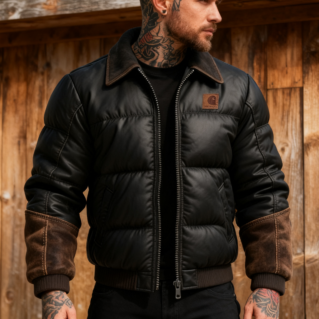 Leather Quilted Puffer Jacket With Outdoor Work Cuff Reinforcement