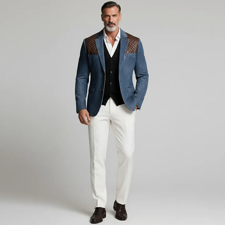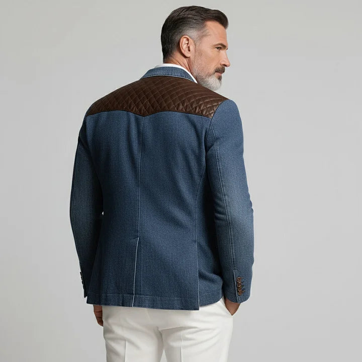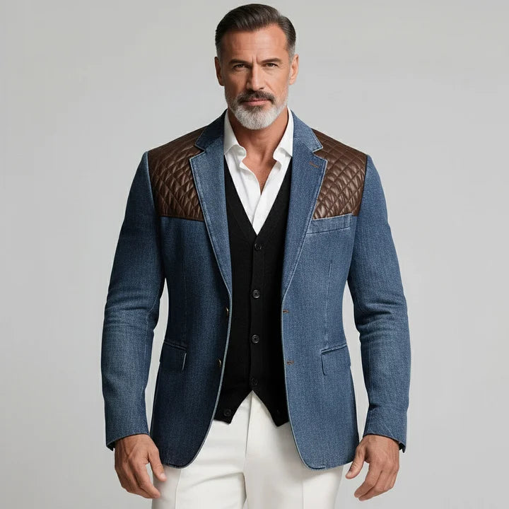 Mens Blue Quilted Brown PU Leather Shoulder Patches Notch Lapel T