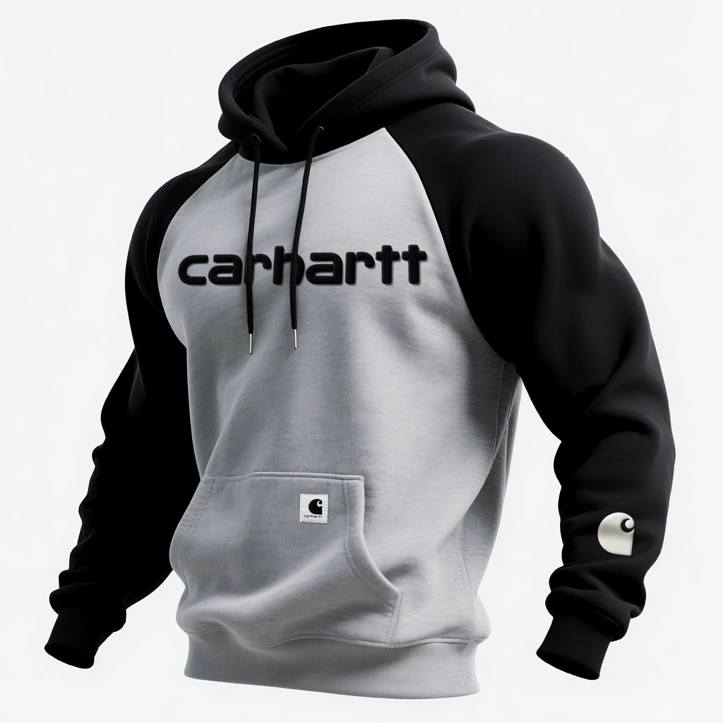 • Design Elements: Contrasting sleeve colors, front pocket with logo patch, sleeve logo detail
