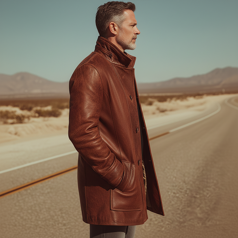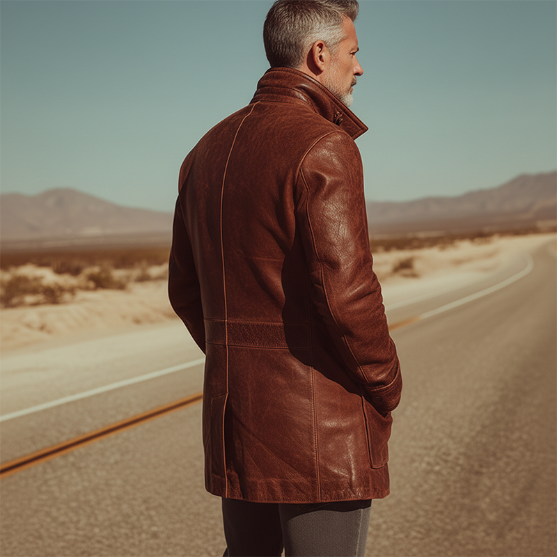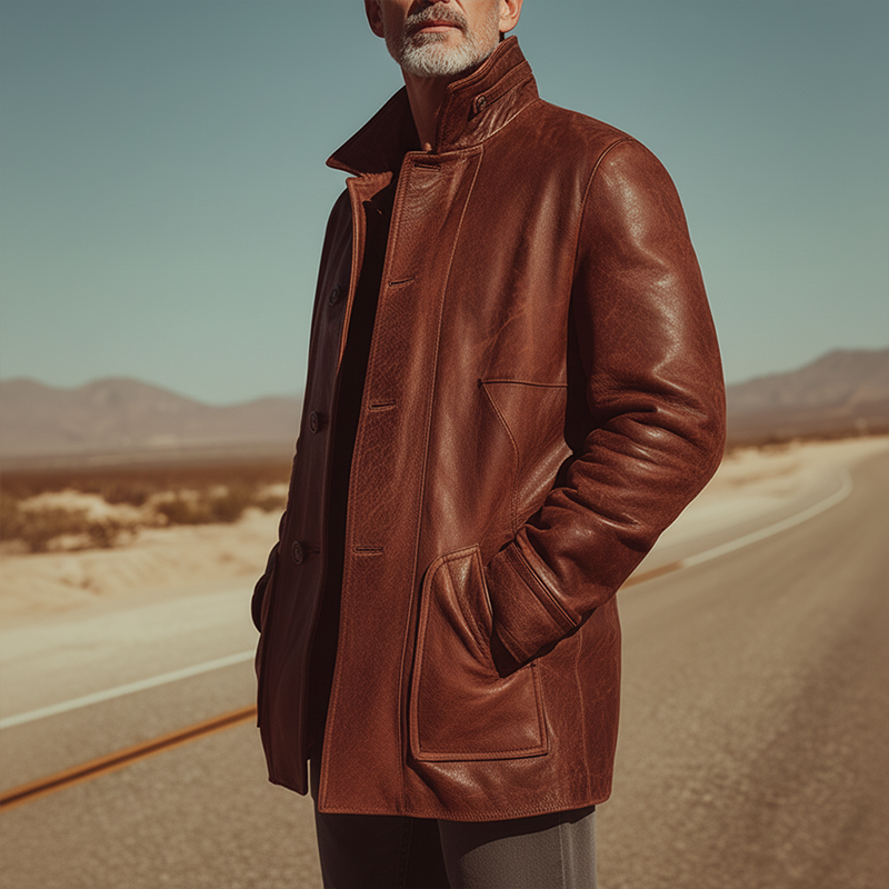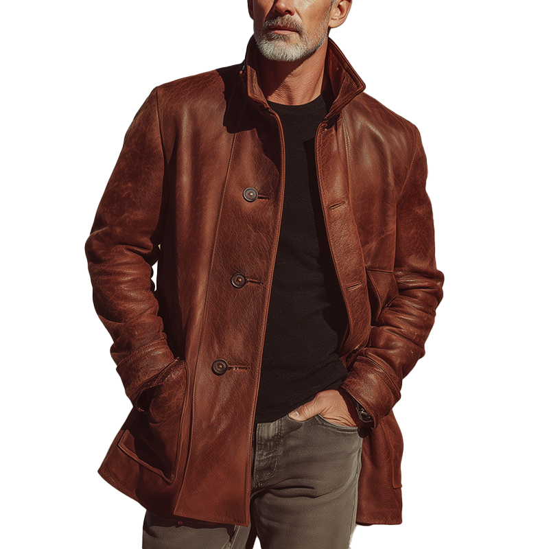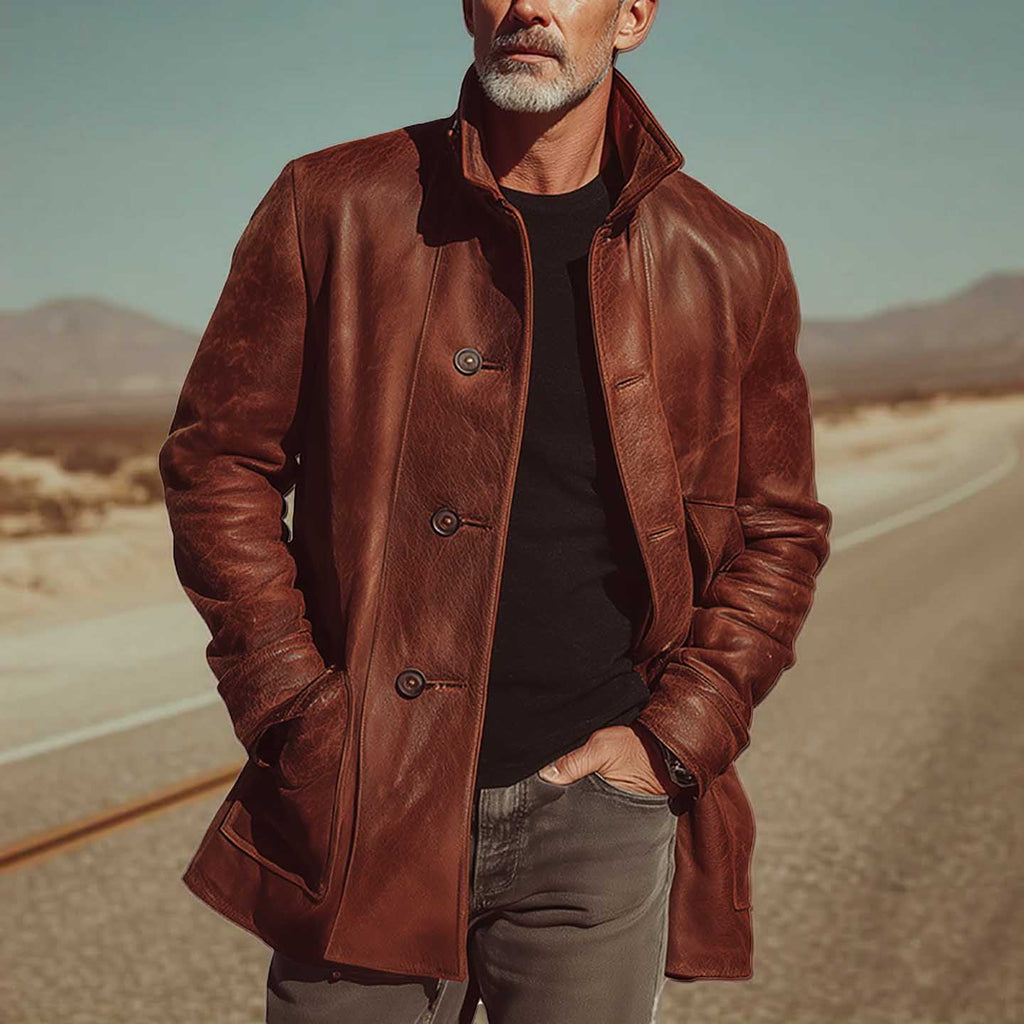 • Chaqueta de cuero ajustada con cremallera y cuello alto con estampado de piedras para hombre