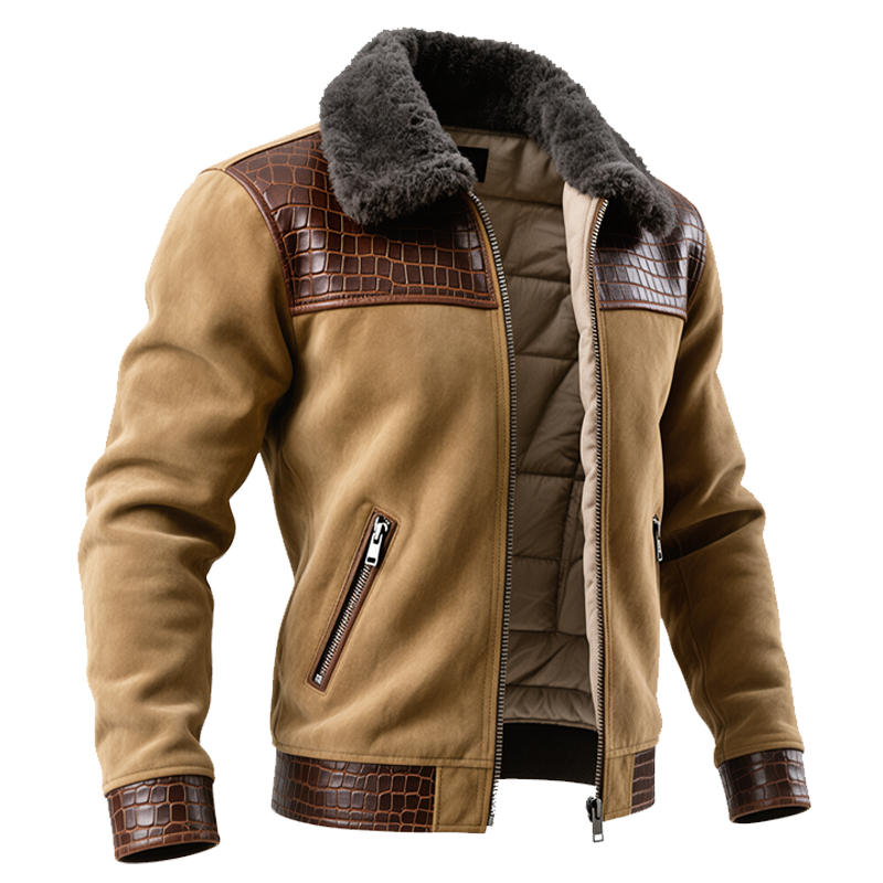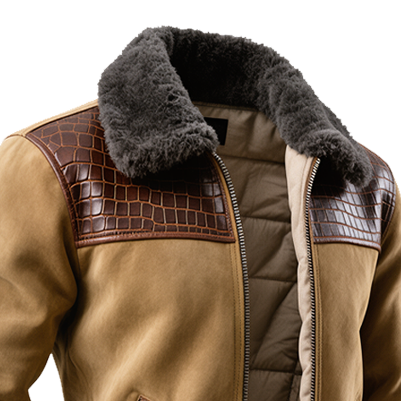 Warm Khaki Jacket With Faux Fur Collar And Leather Accents