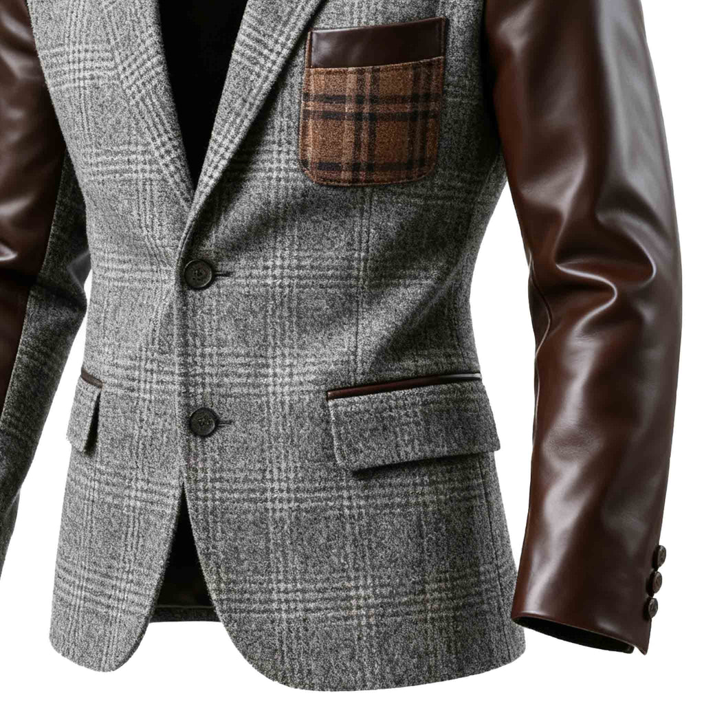 Men's Vintage Gray Plaid Wool Brown Leather Sleeves Blazer Jacket