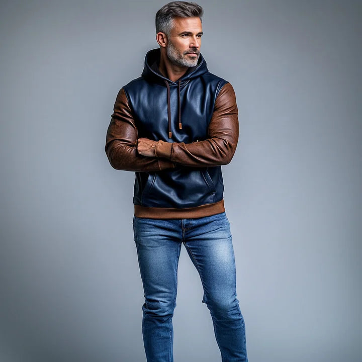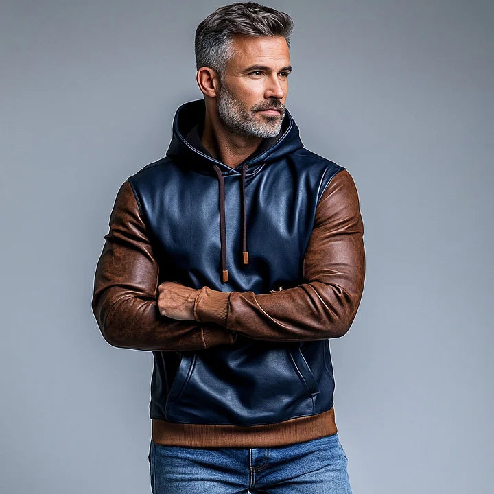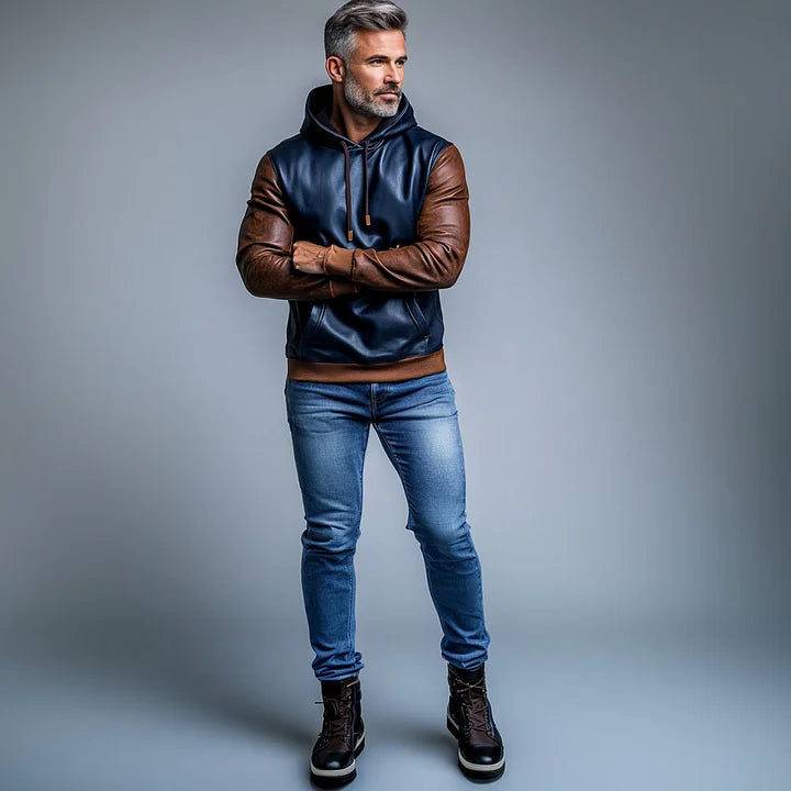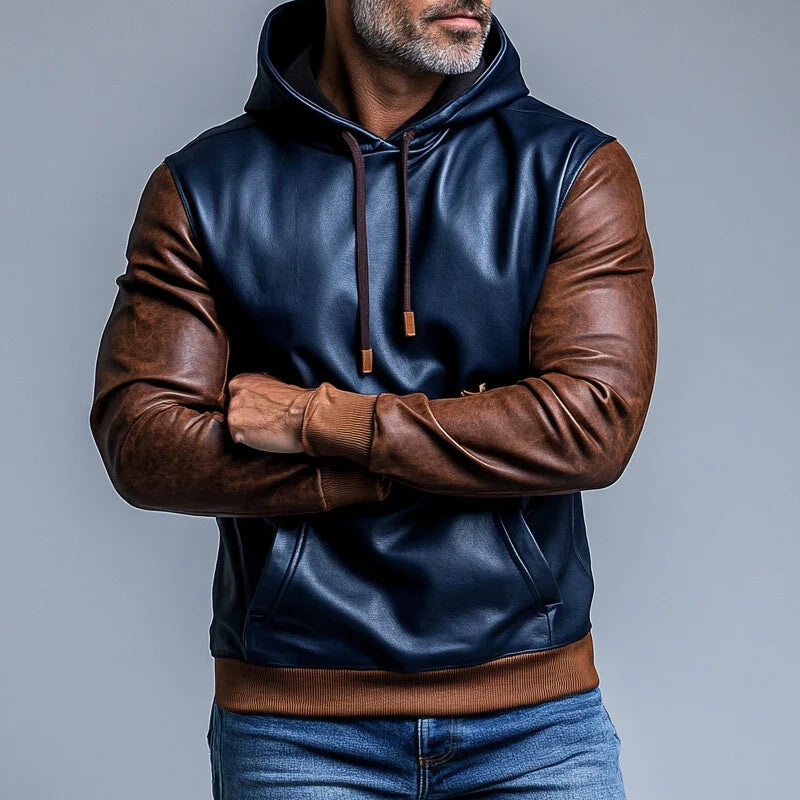 Mens PU Leather Two Tone Pocket Long Sleeve Drawstring Hoodie