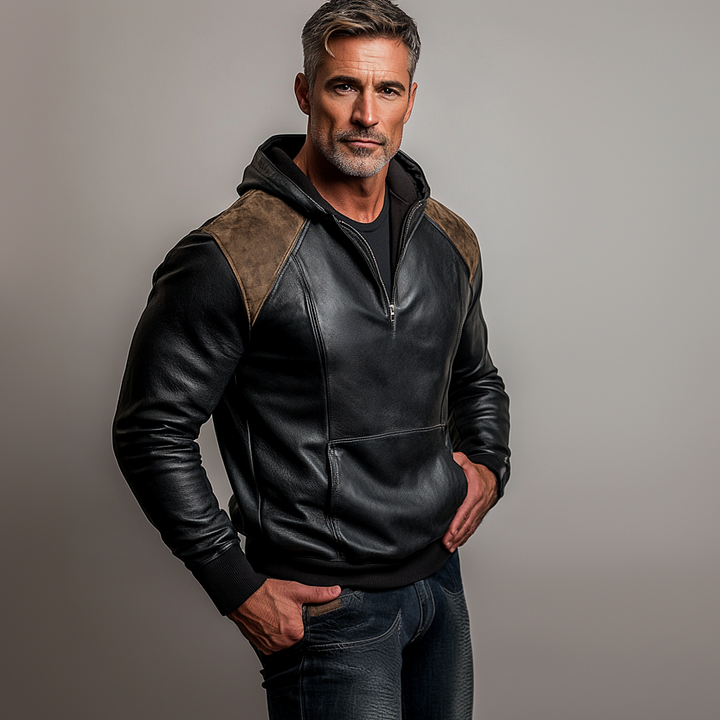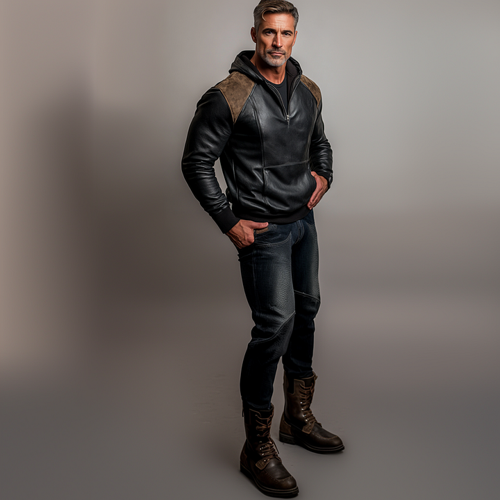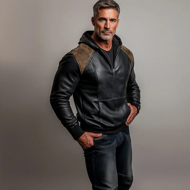 Mens PU Leather Patchwork Half Zip Pocket Hoodie