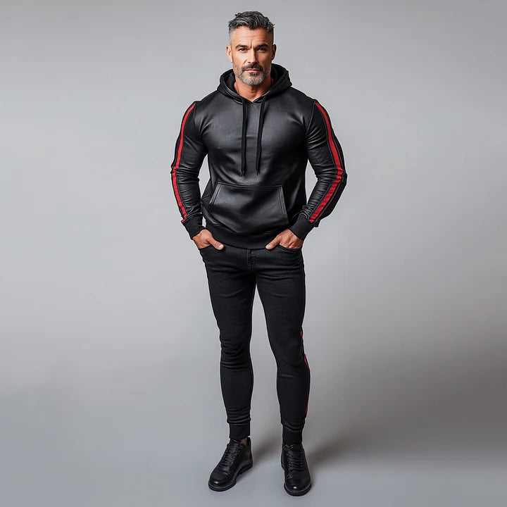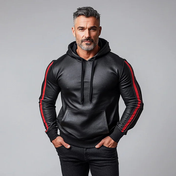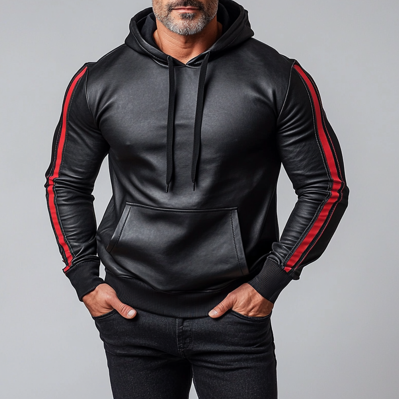 Mens Casual Contrast Striped PU Leather Drawstring Hoodie
