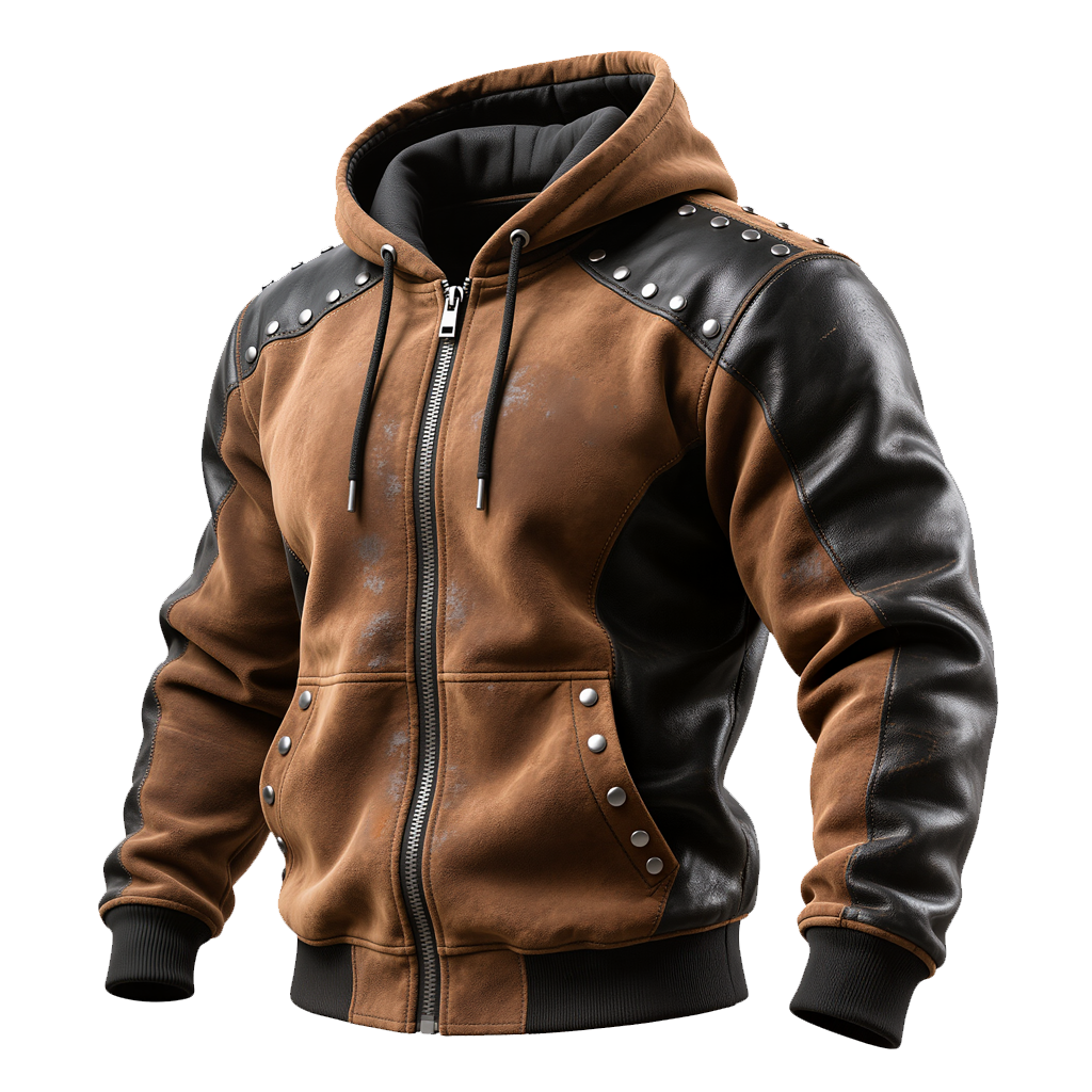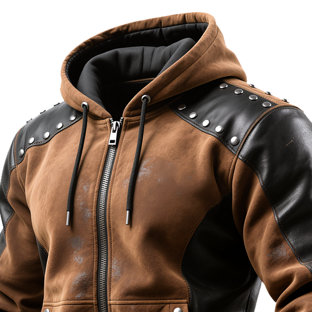 Brown And Black Leather-Trimmed Hoodie Jacket
