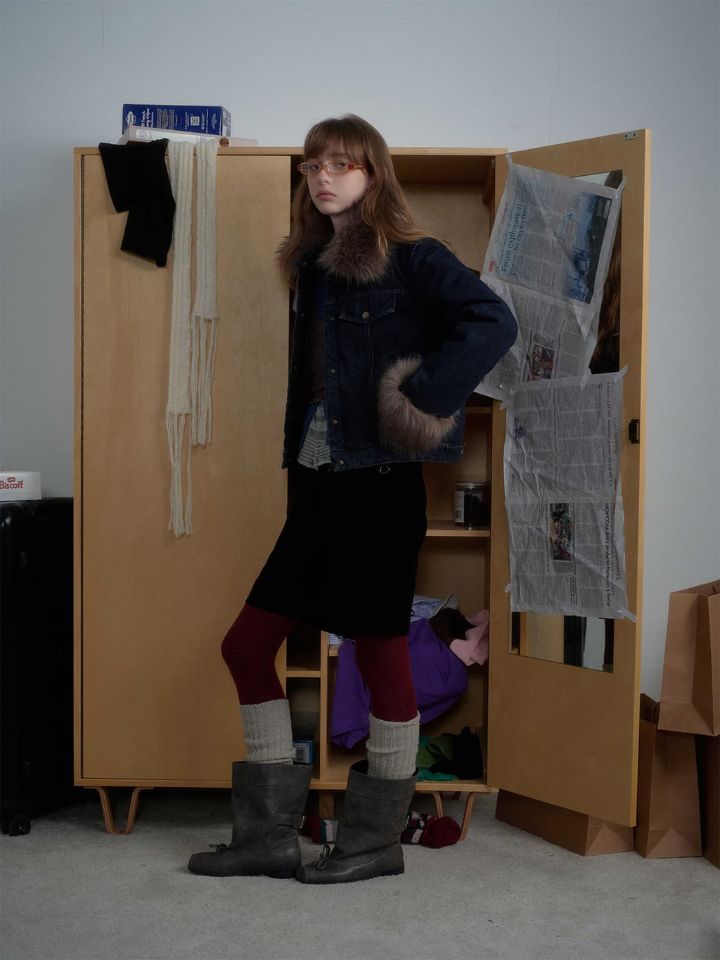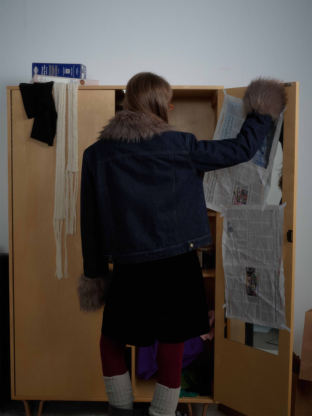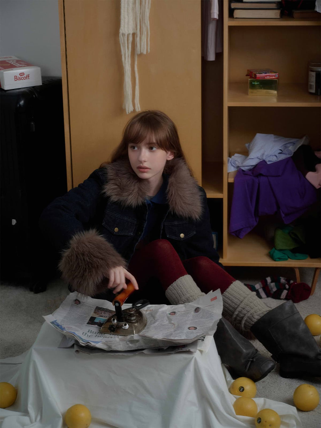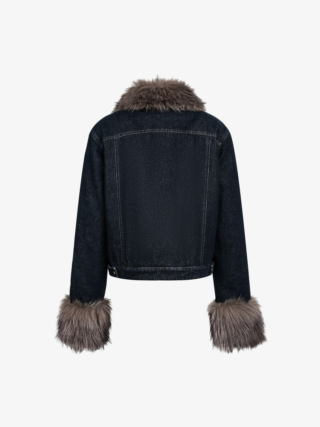 American Retro Detachable Fur Collar Raw Cowhide Work Denim Jacket