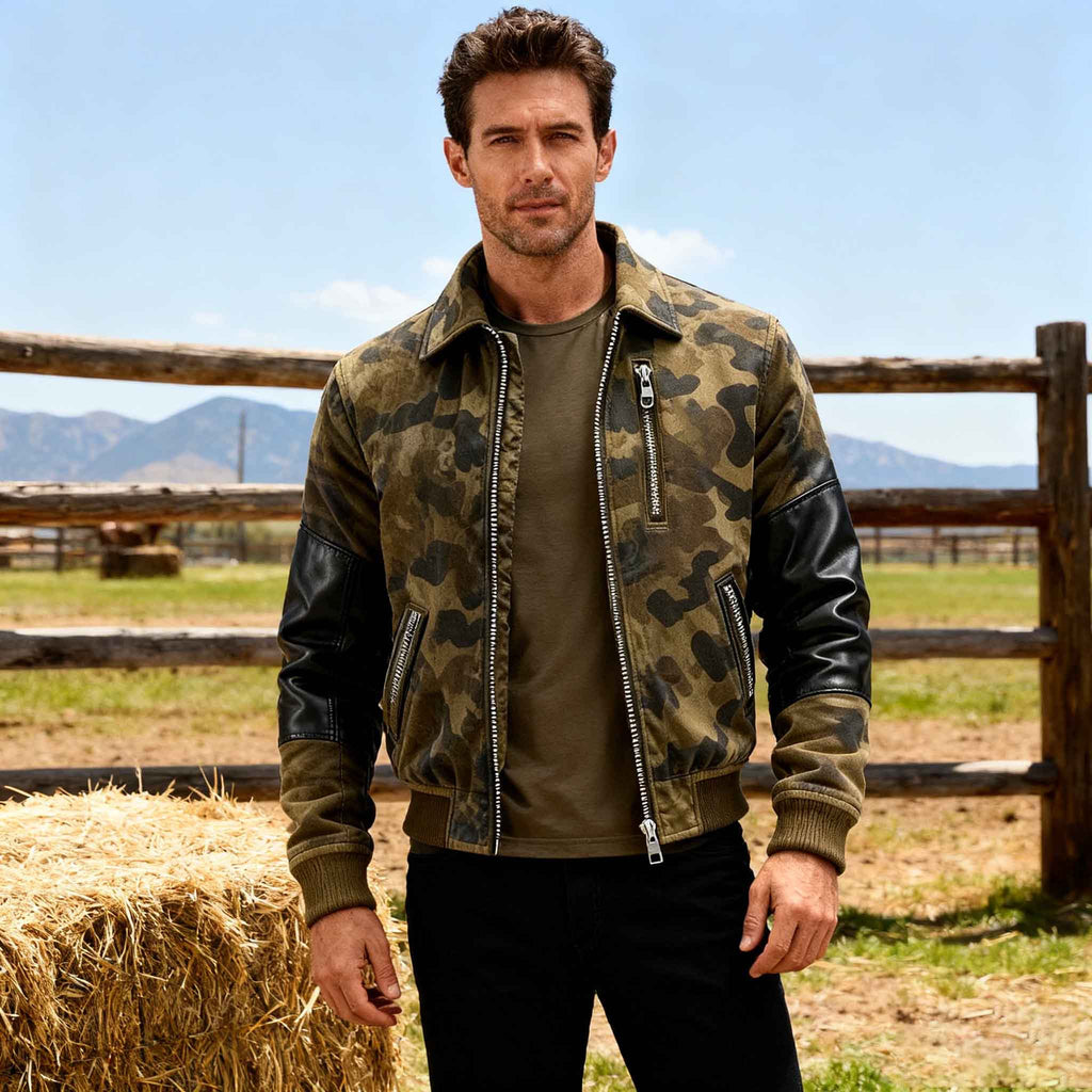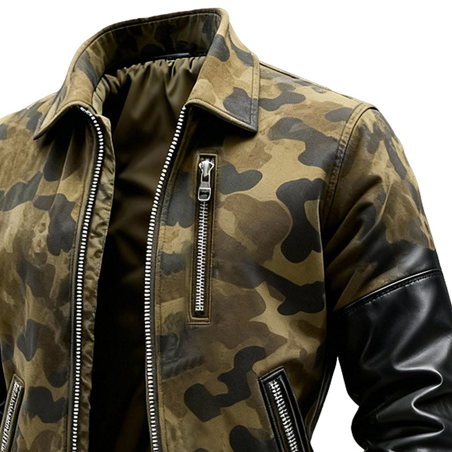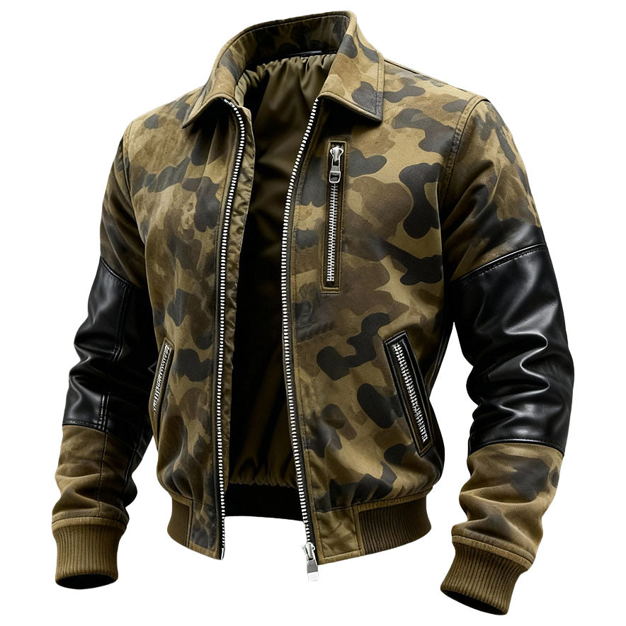 Men's Vintage Camouflage Patchwork Black Leather Lapel Jacket