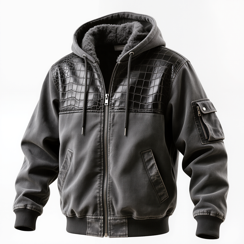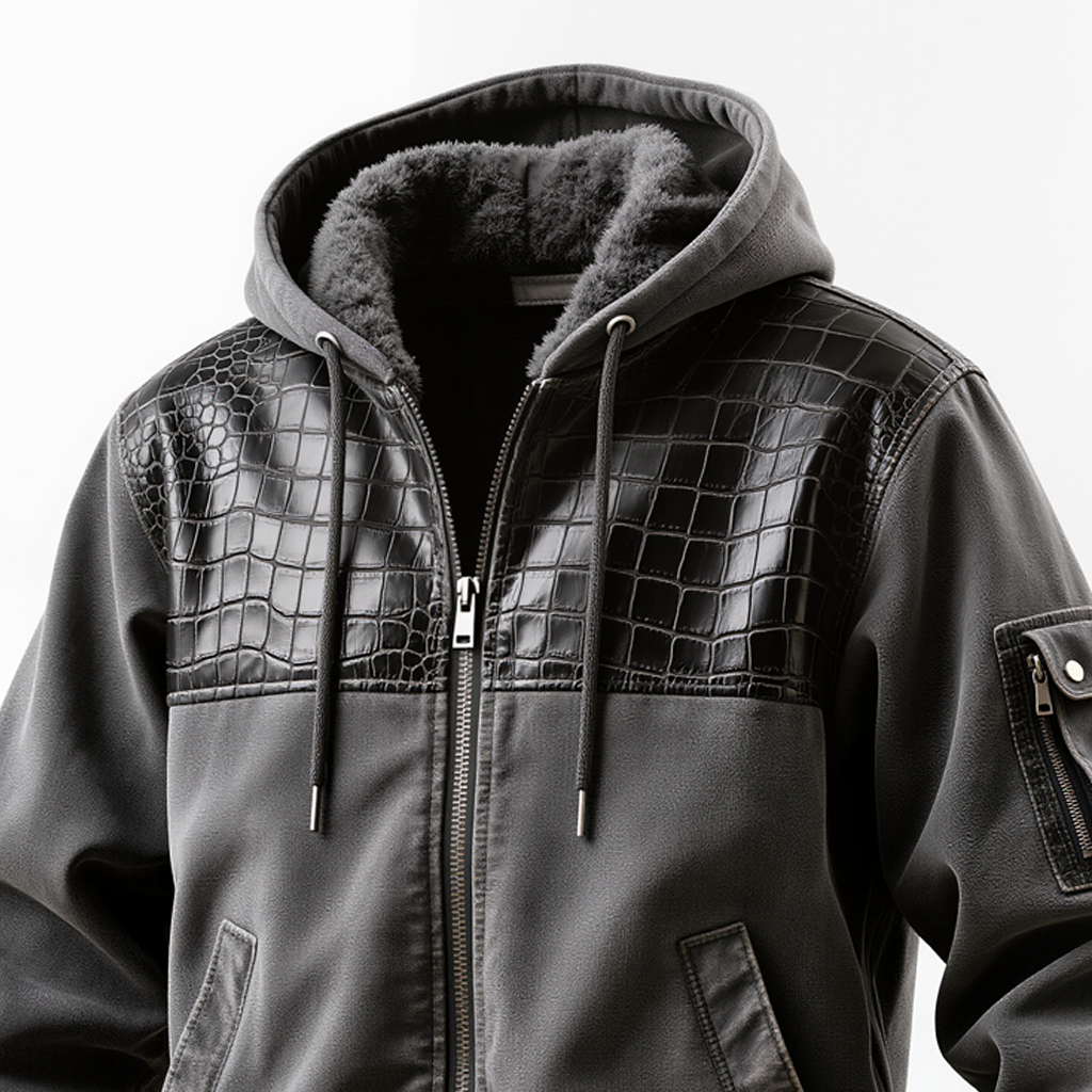 • Design Elements: Crocodile texture panels on the chest, zippered arm pocket, and fleece-lined hood