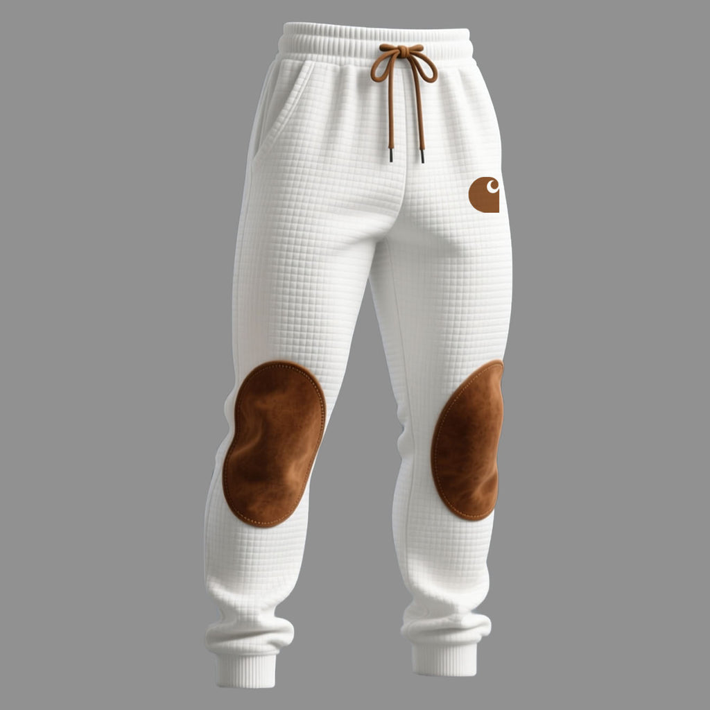 Men's Vintage White Waffle Quilted Plaid Stitching Brown Suede Pocket Hoodie And Sweatpants Jogger Set