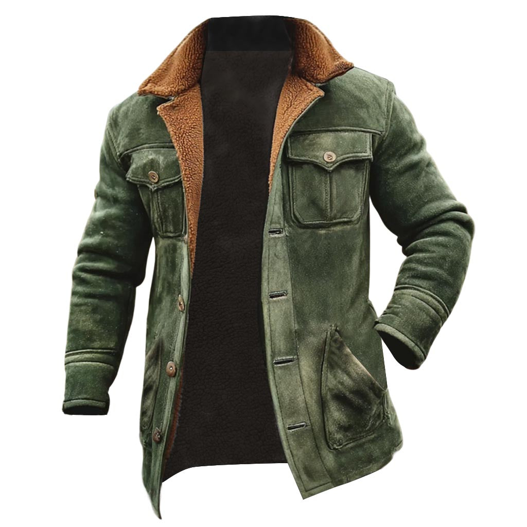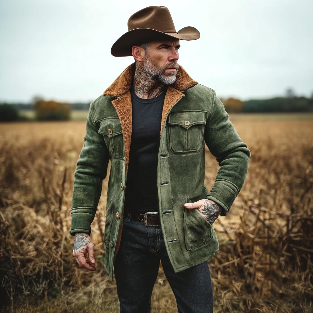 Men's Vintage Outdoor Army Green Suede Fleece Multi-Pocket Lapel Shearling Jacket