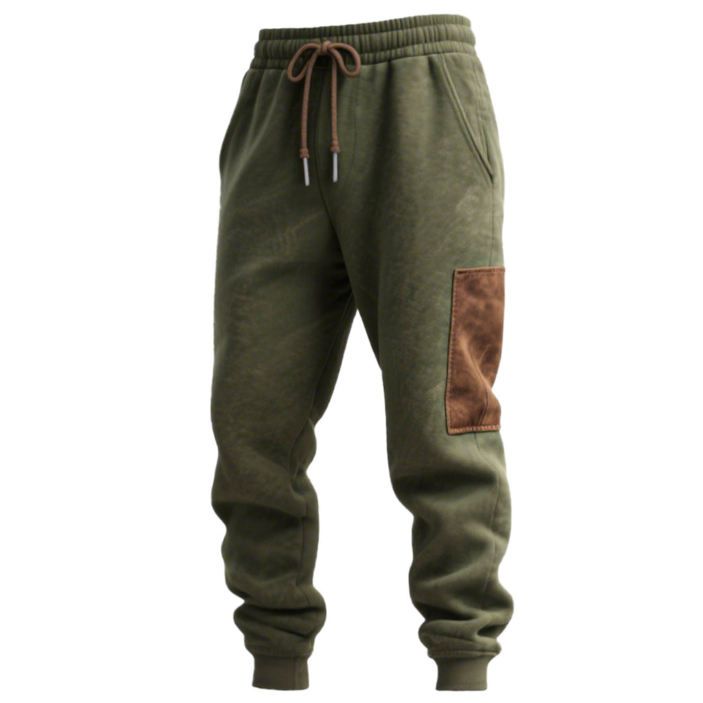 Men's Vintage Army Green Stitching Brown Suede Pocket Hoodie And Sweatpants Jogger Set