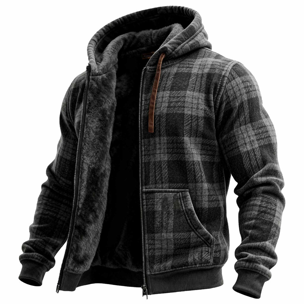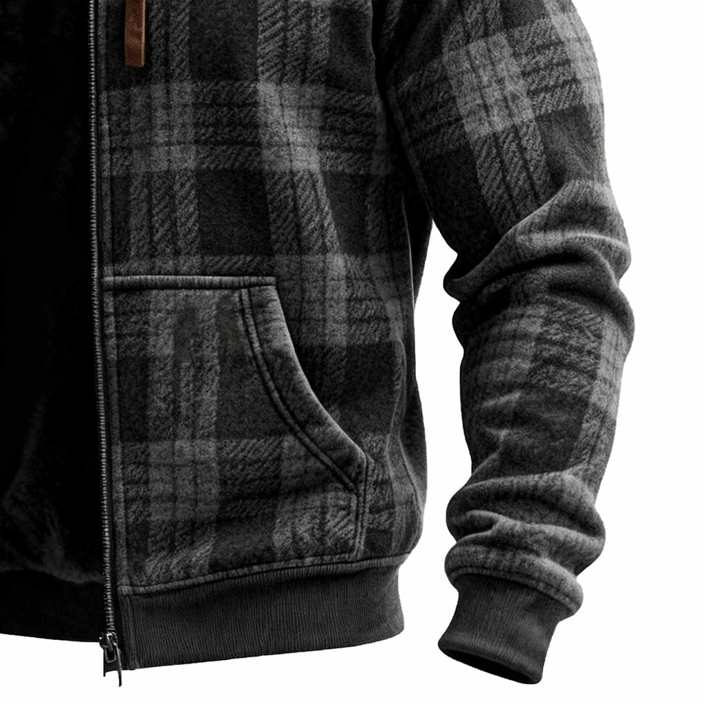 Men's Vintage Western Cowboy Plaid Fleece Pocket Hoodie Jacket