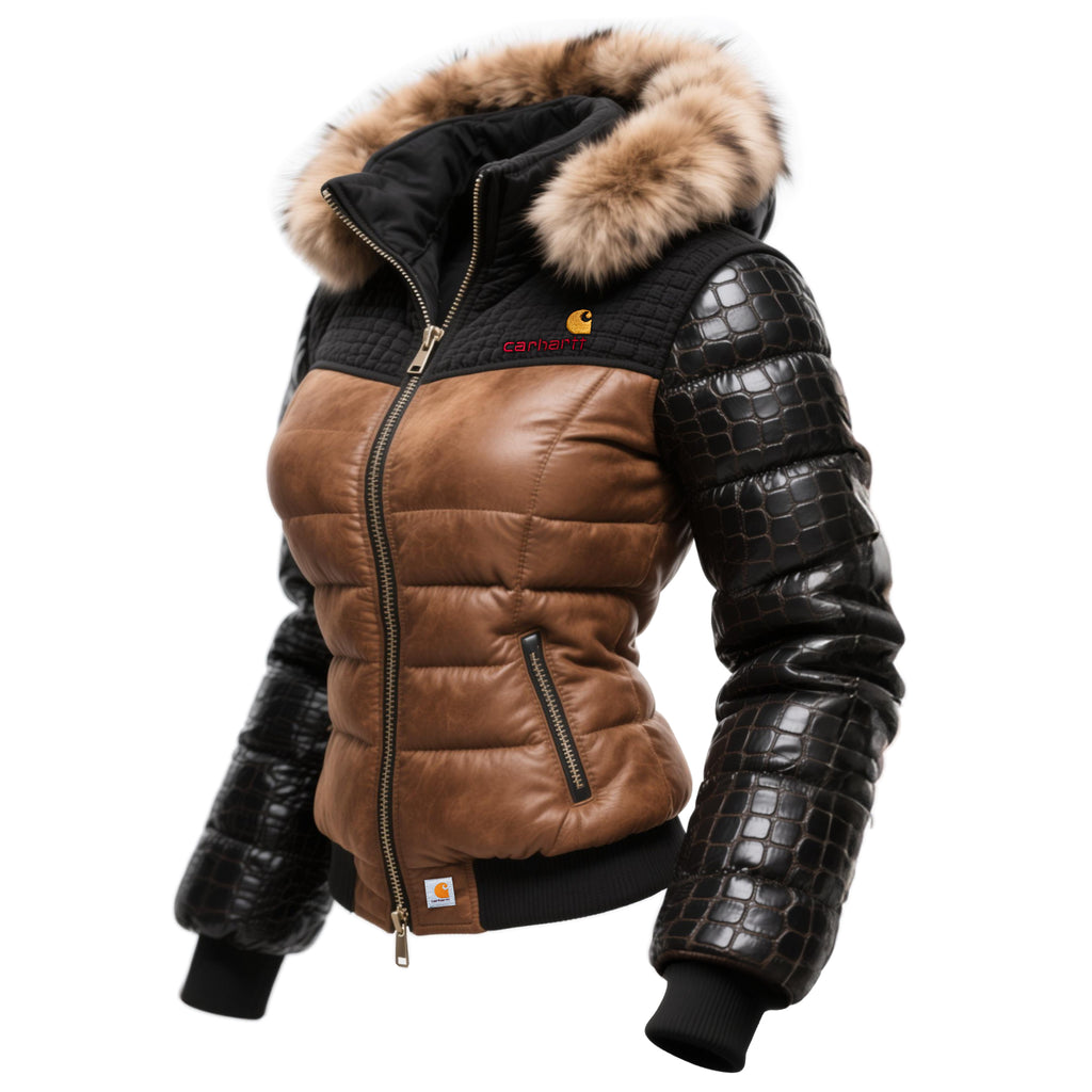 Vintage Women's Crocodile Embossed Leather Spot Color Stitching Fur Collar Hooded Jacket