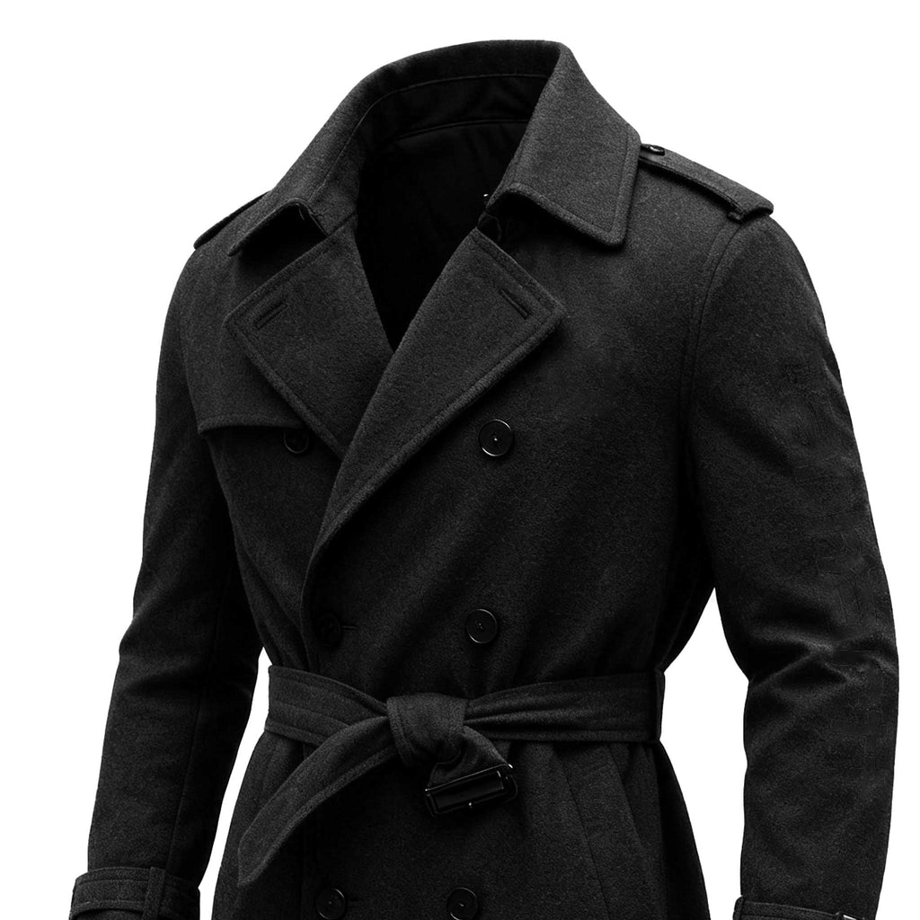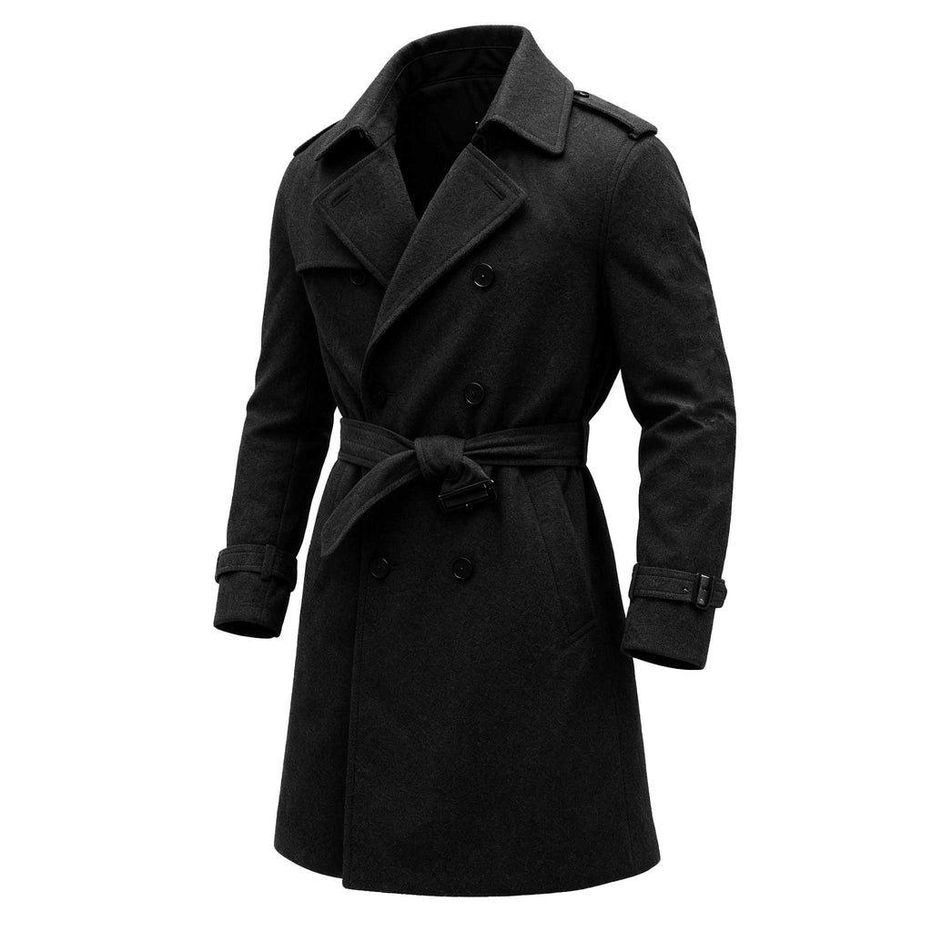 Men's Vintage Black Wool Double-Breasted Trench Coat With Belted Waist