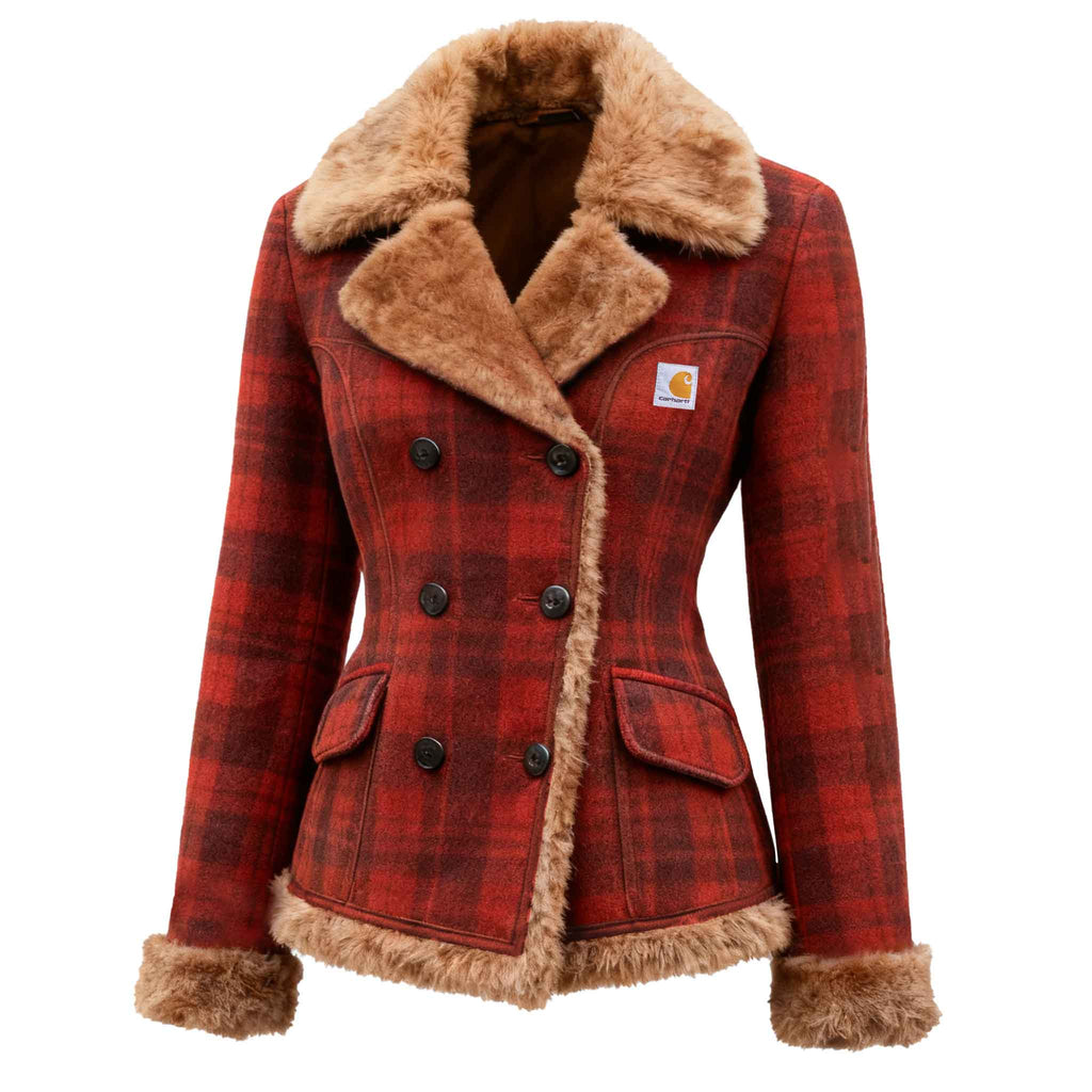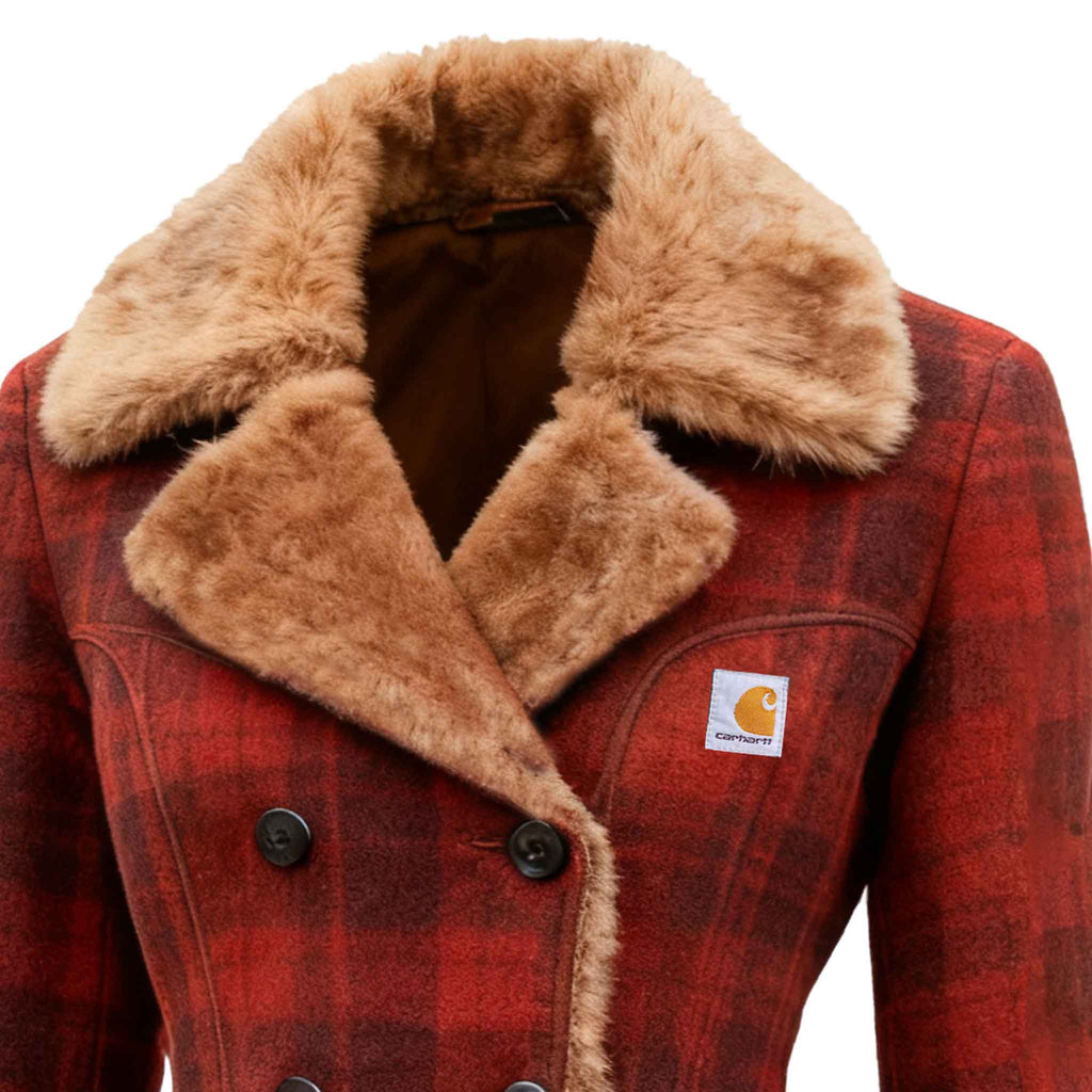 • Design Elements: Double-breasted front closure, faux fur collar and cuffs, plaid pattern