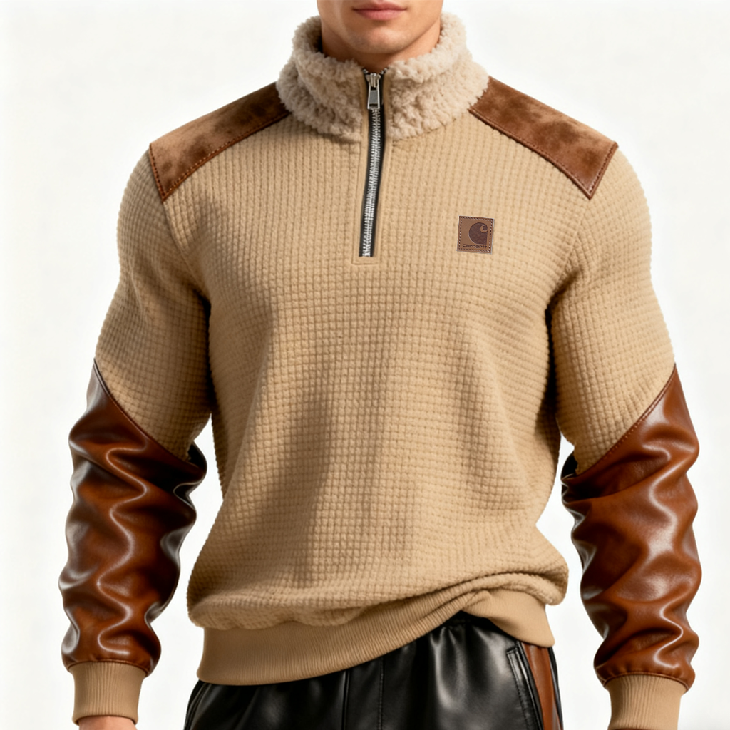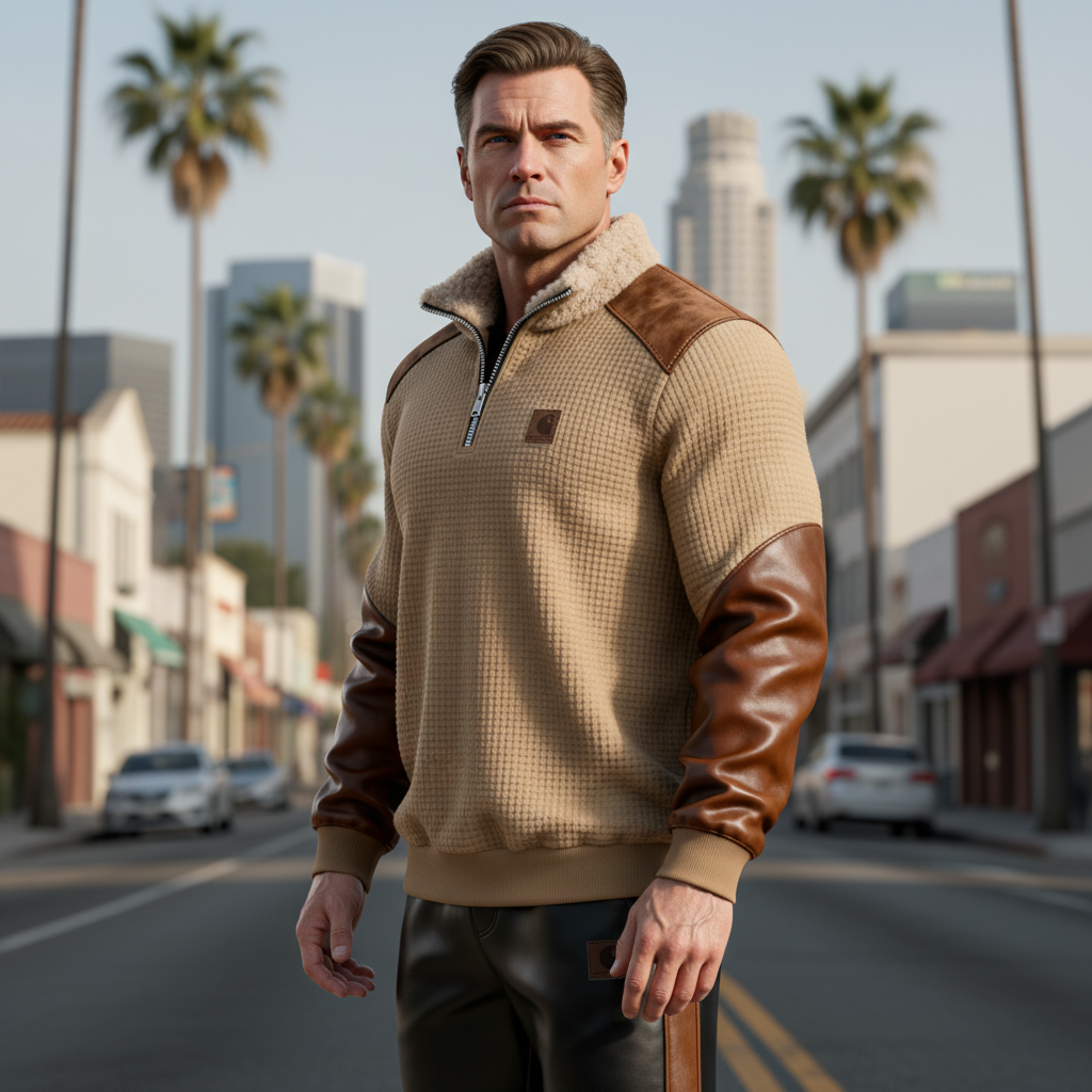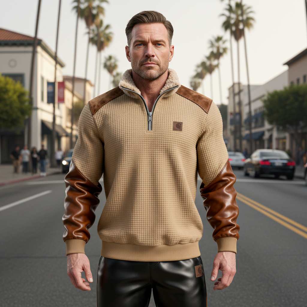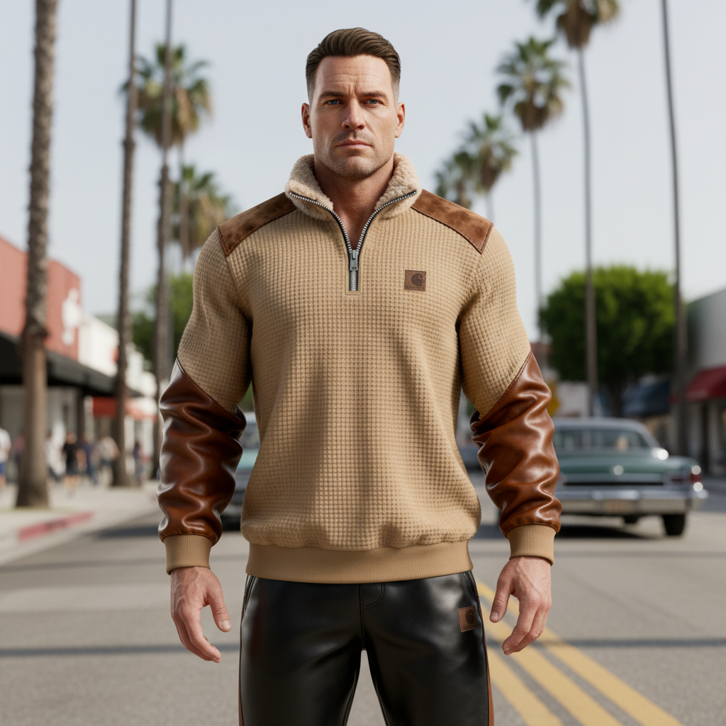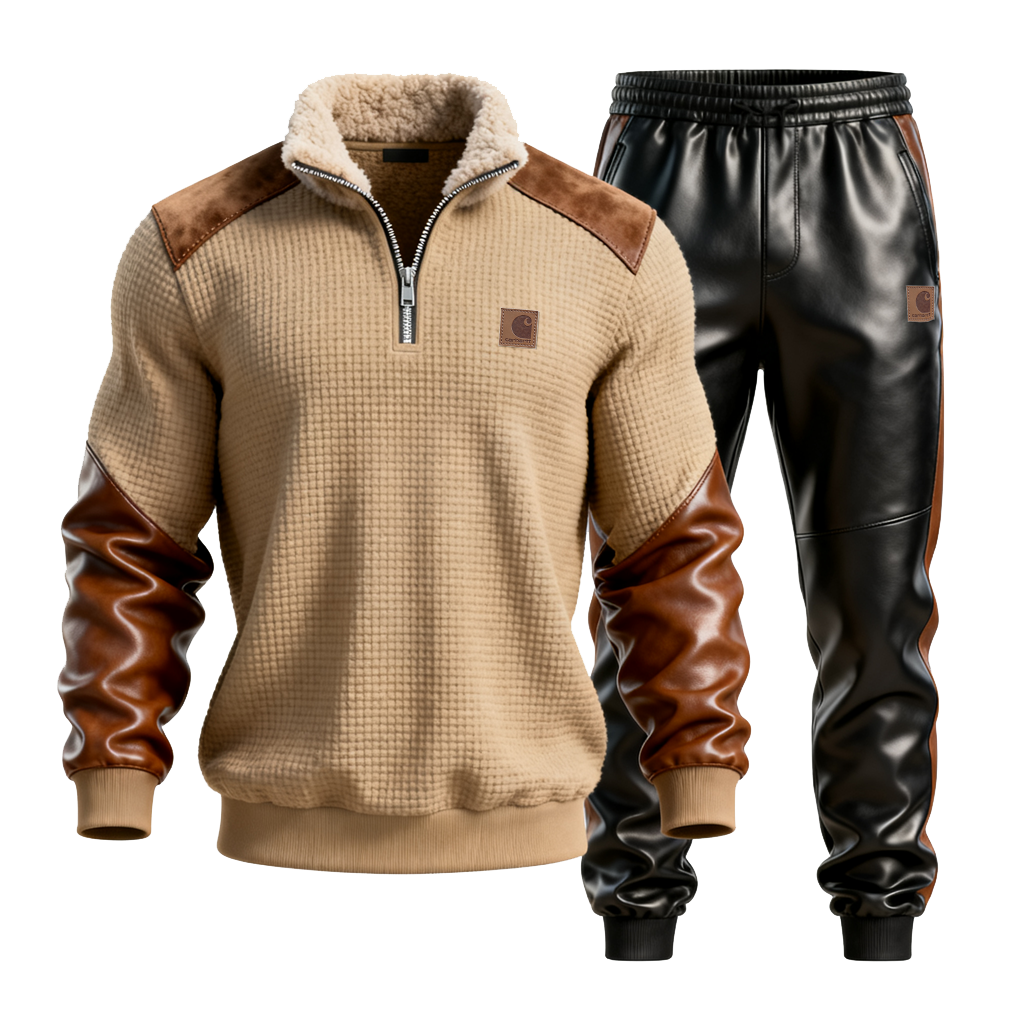 Men's Retro Casual Waffle Warm And Stylish Winter Outfit Fleece Jacket With Leather Sleeves And Shiny Track Pants