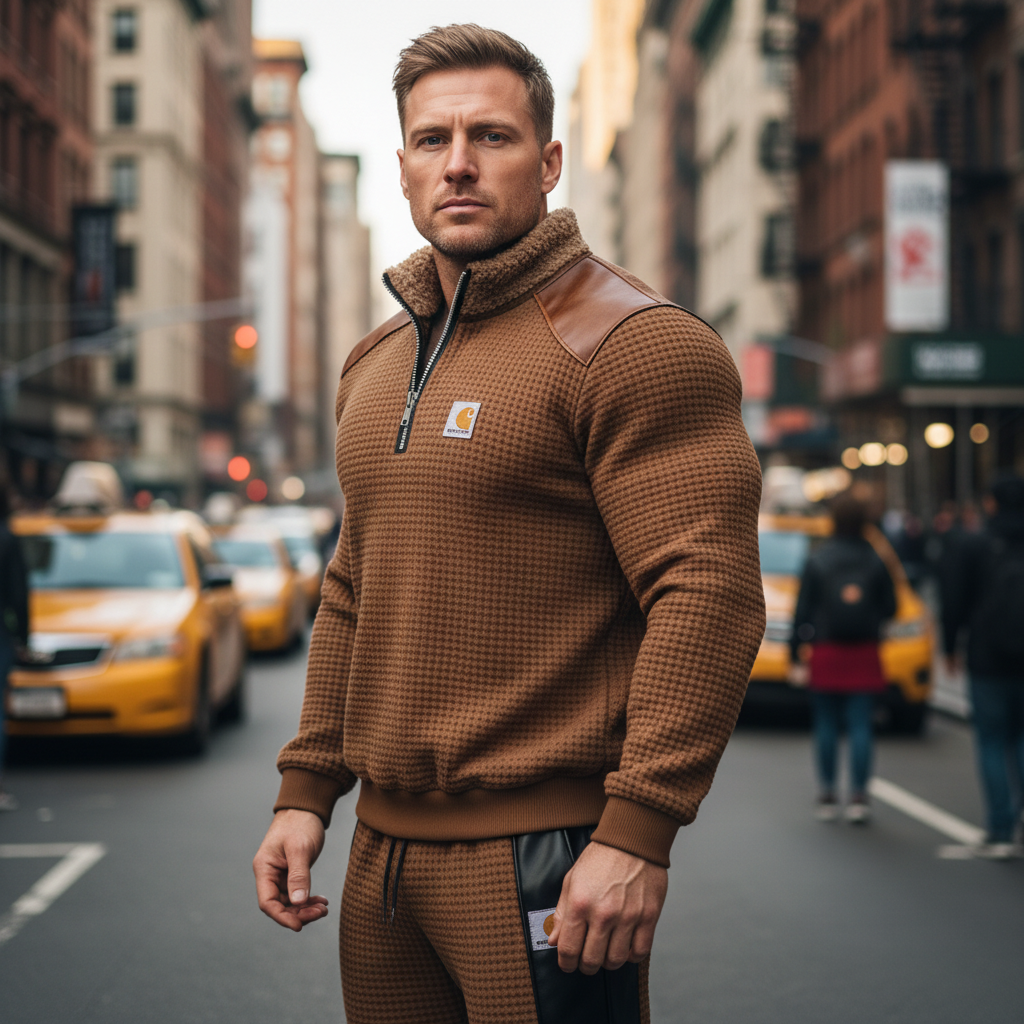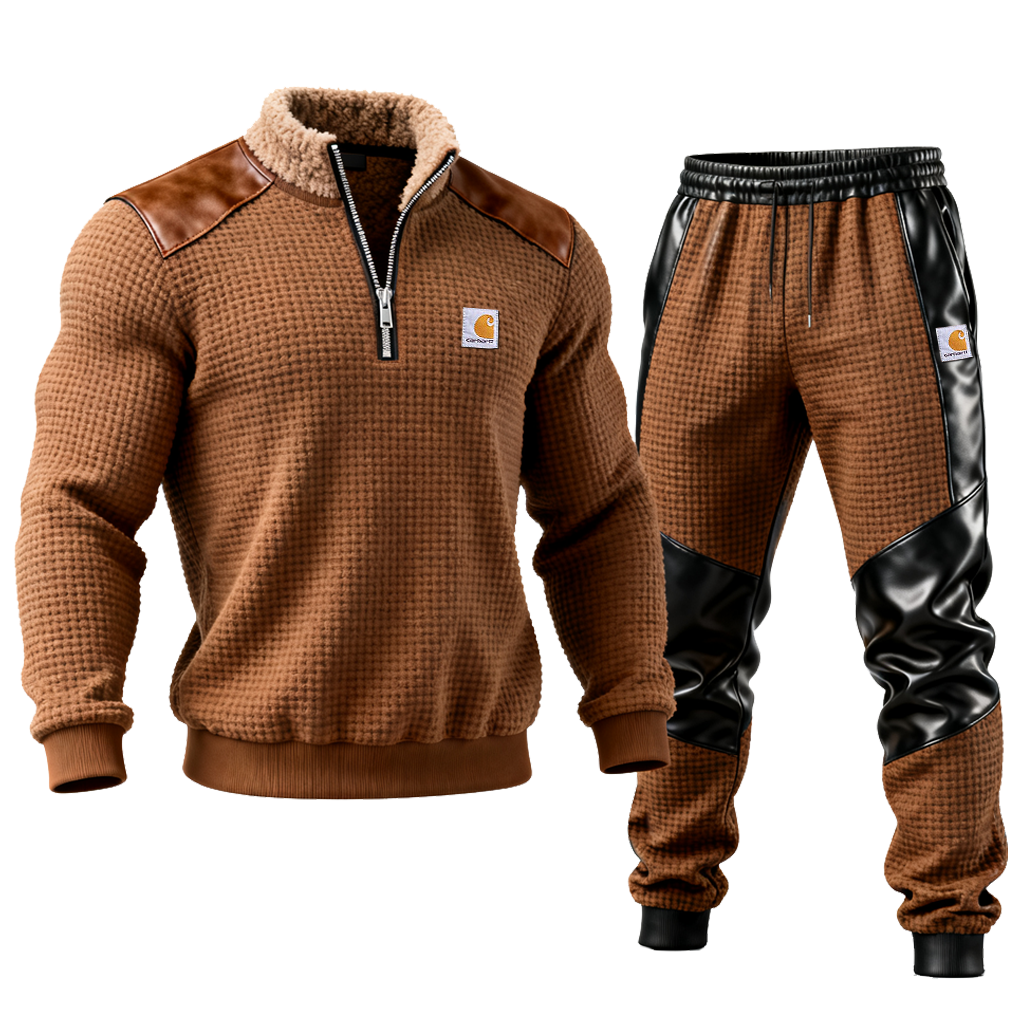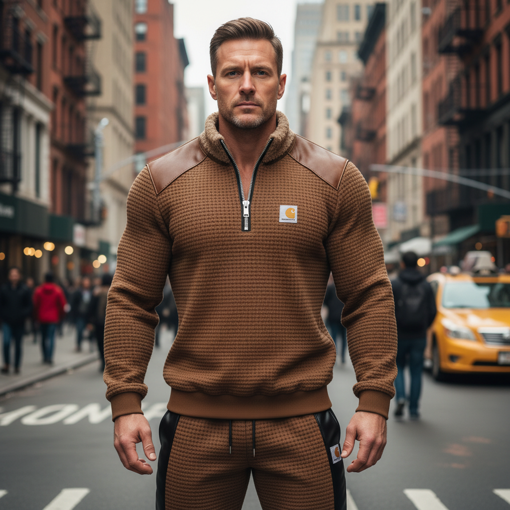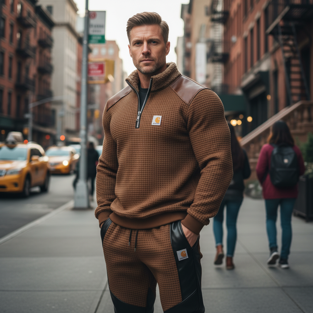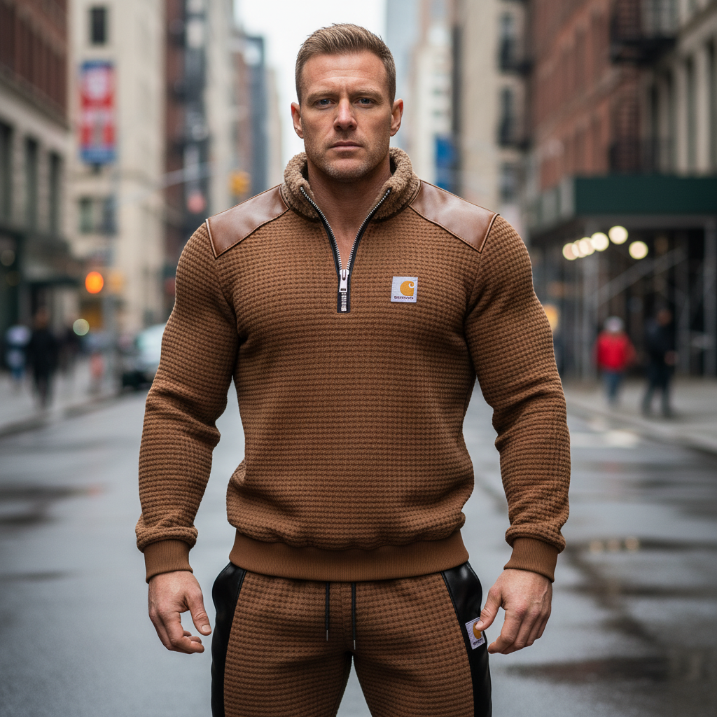 • Design Elements: Faux Leather Accents on Shoulders and Sides, Half-Zip Closure, Embroidered Logo Patch
