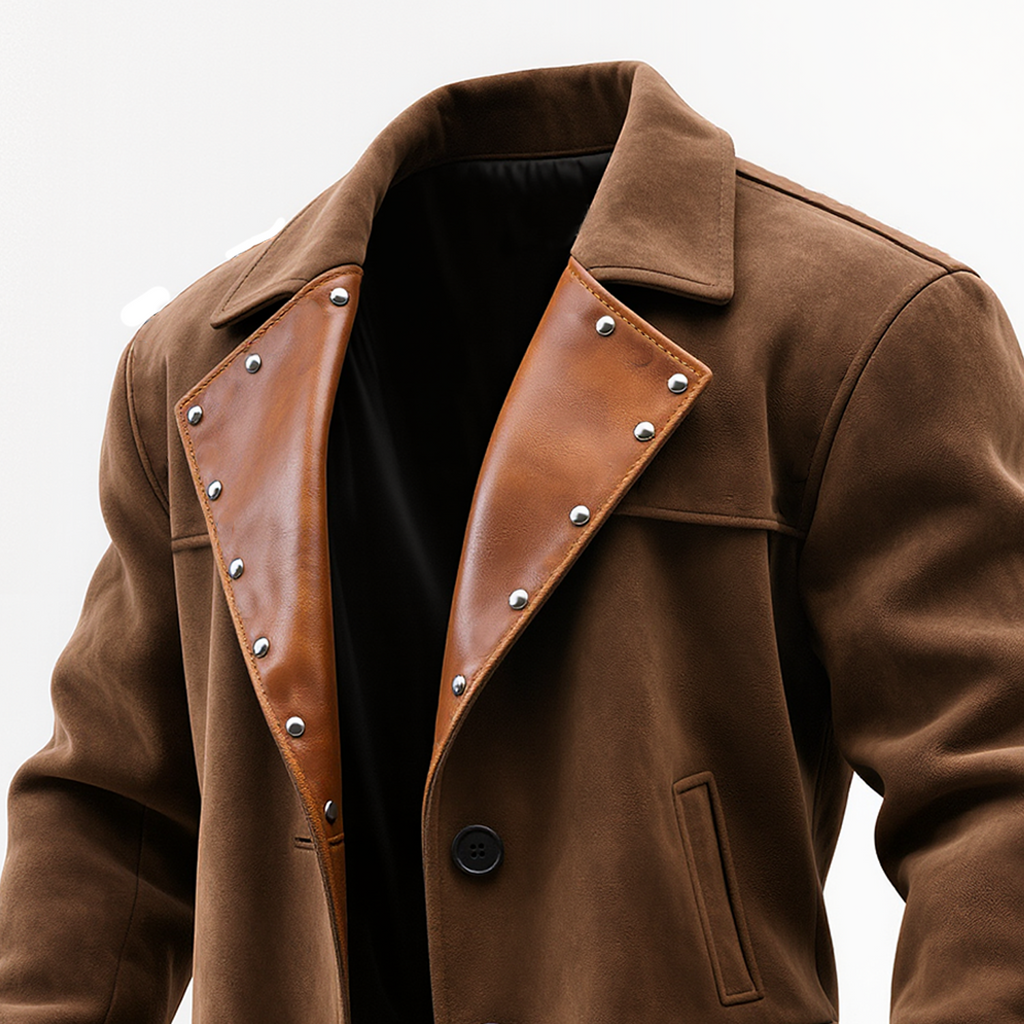 • Design Elements: Leather trim with studs on lapels, double-breasted button closure, and sleek pocket design