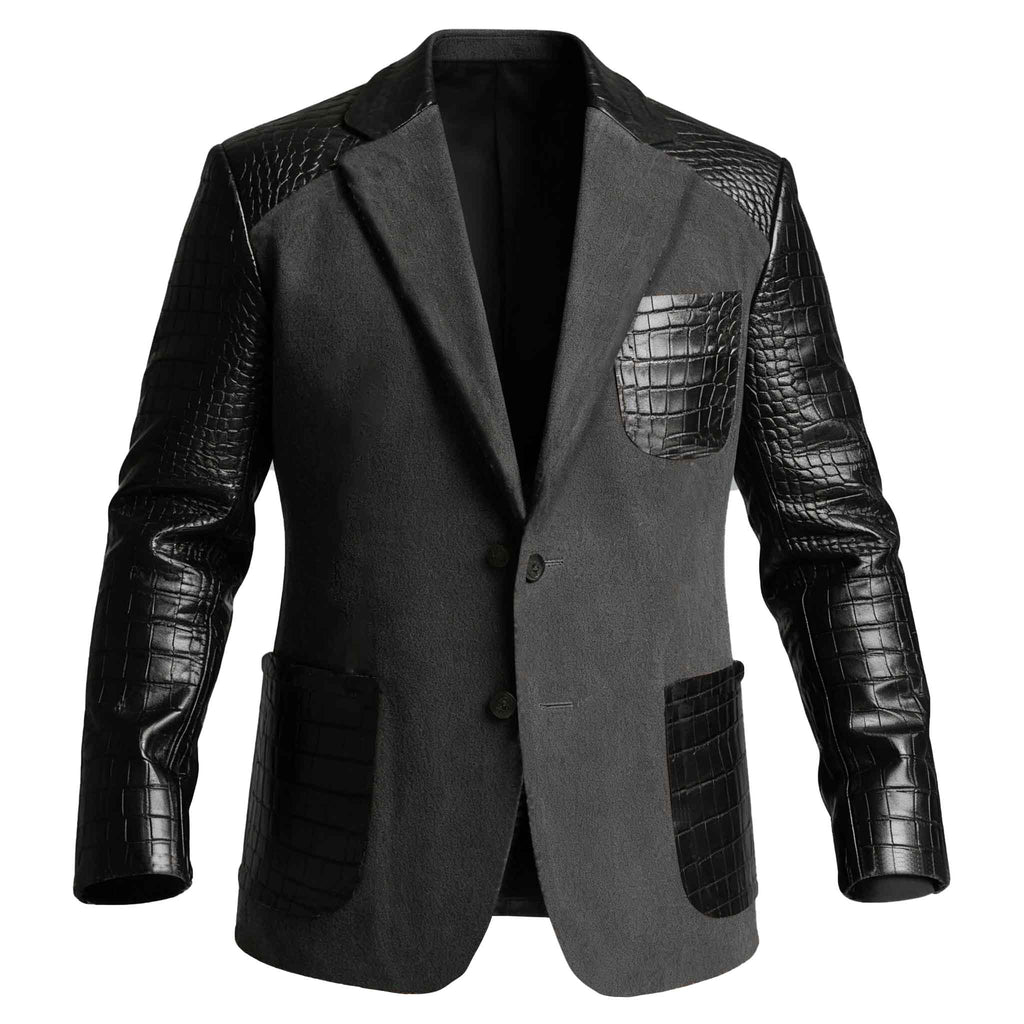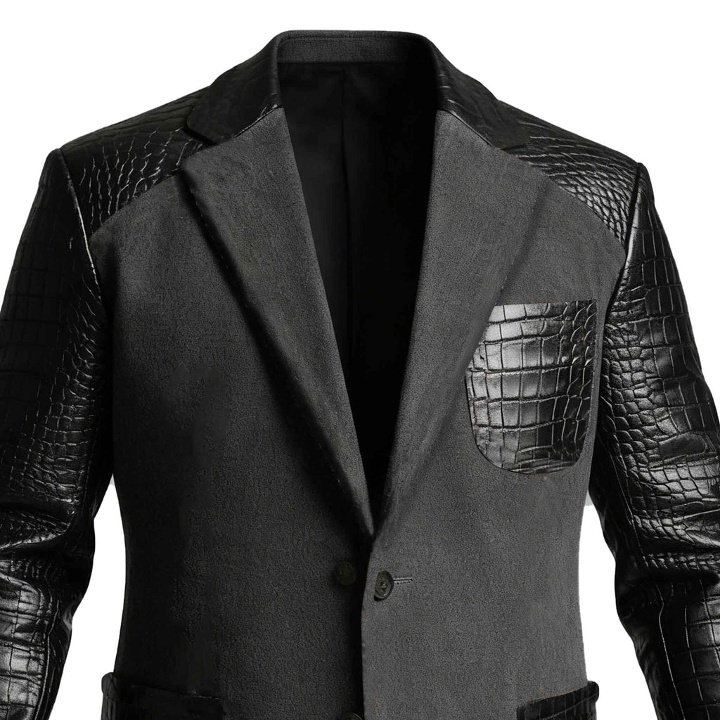 • Design Elements: Crocodile-patterned leather sleeves and pocket trims, intricate stitching details along the lapel and edges