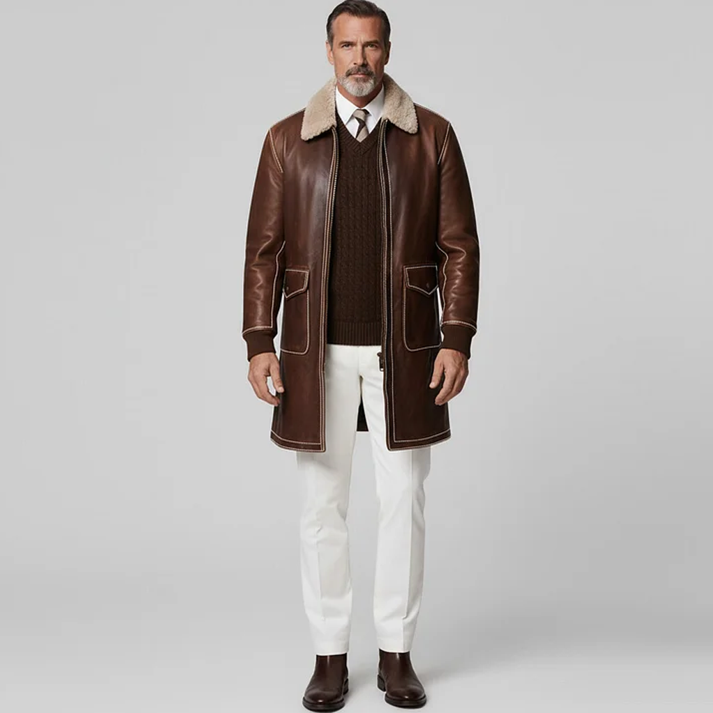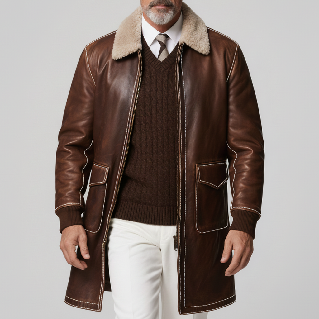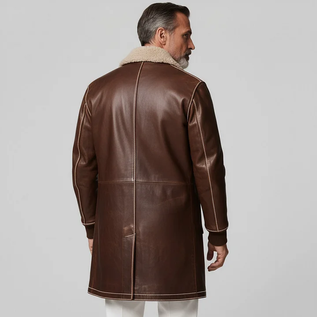 Men's Retro Classic Brown Leather Coat With Shearling Collar