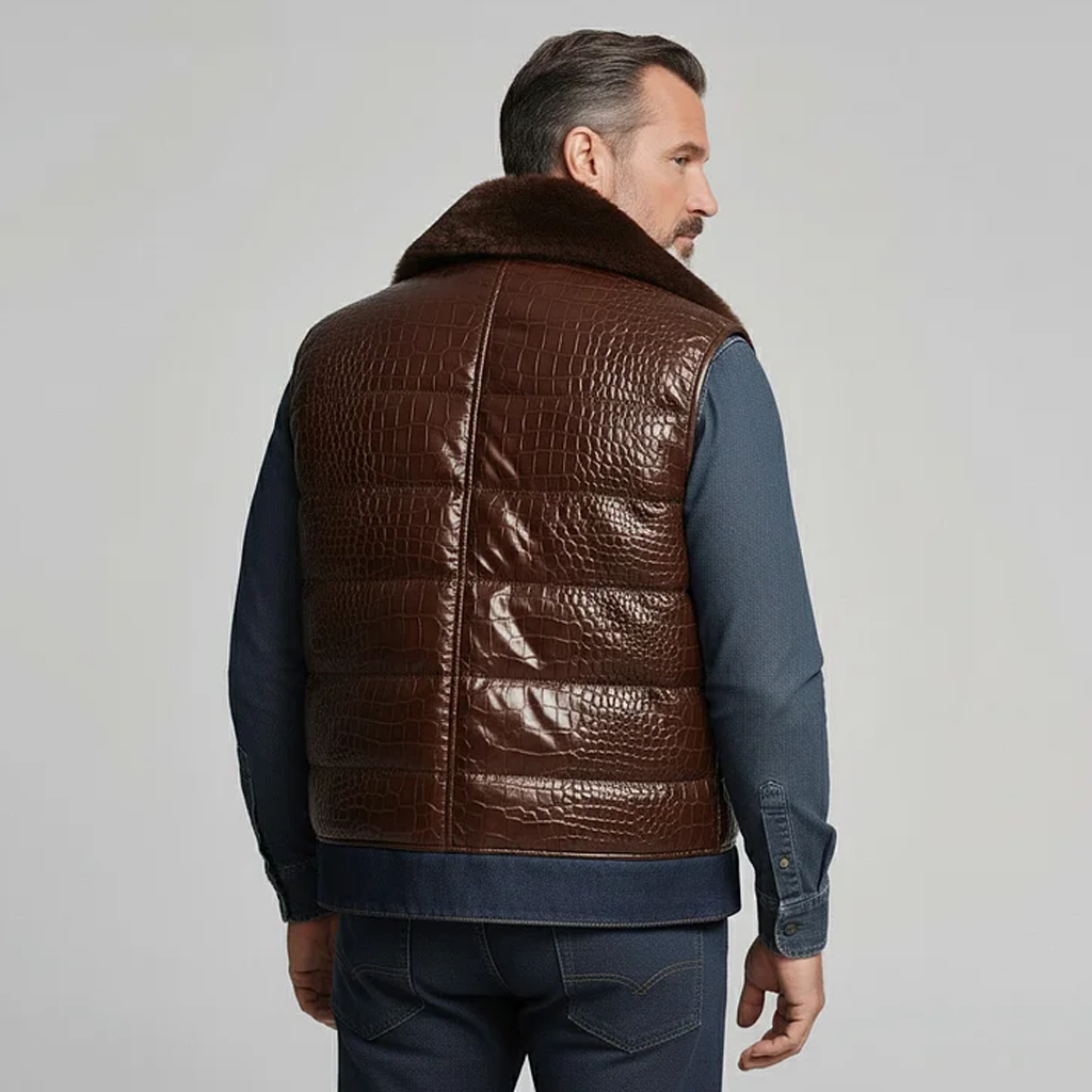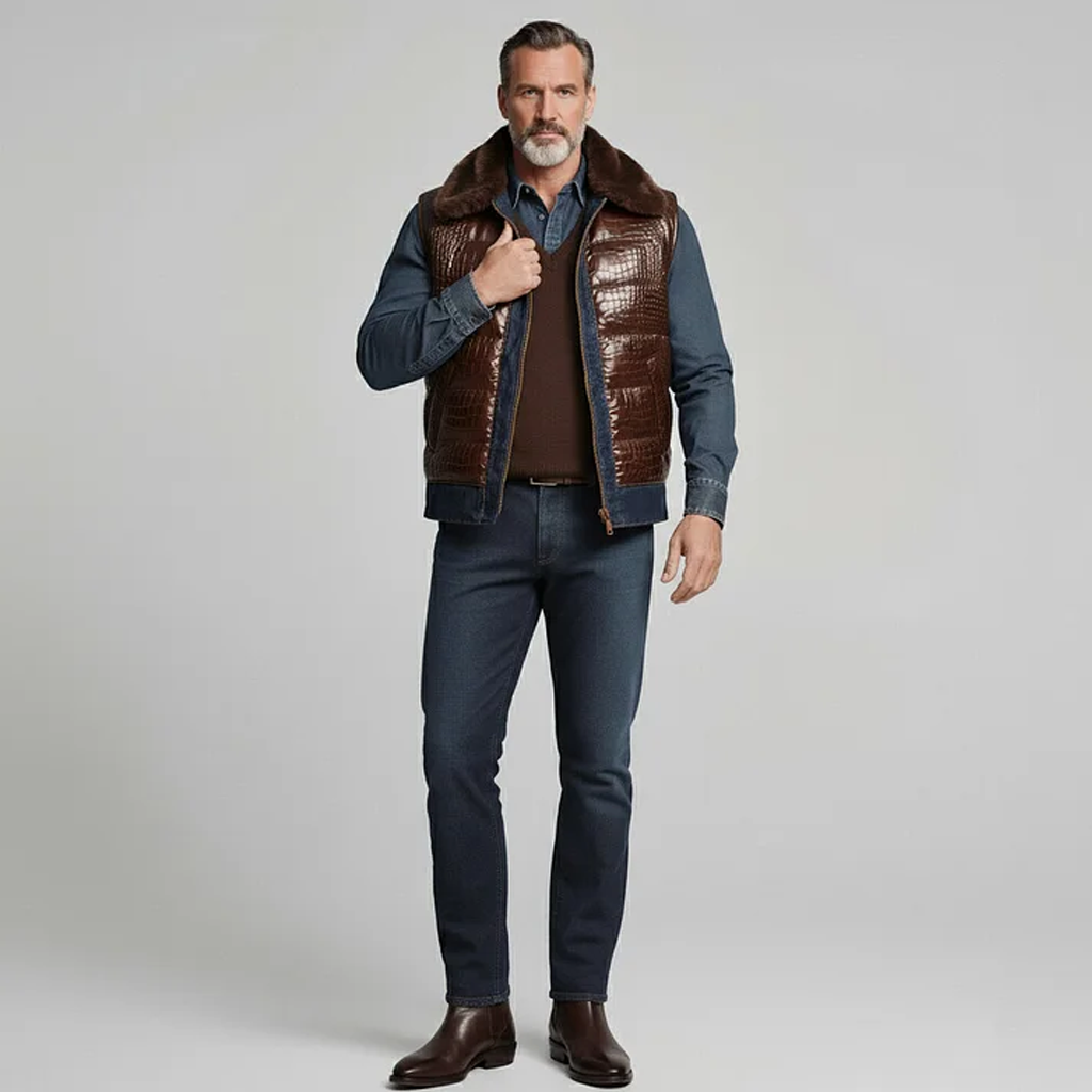 Men's Retro Brown Leather Vest With Fur Collar And Denim Shirt