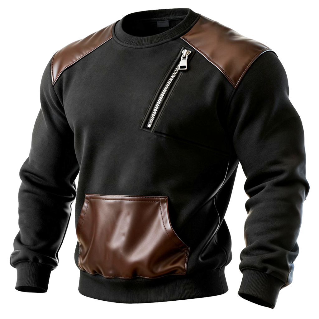 • Design Elements: Half-zip closure, leather shoulder accents, leather pocket panel