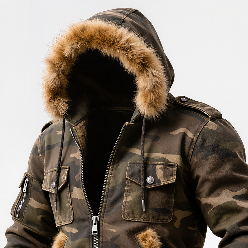 Men's Vintage Camouflage Hooded Jacket With Fur Trim
