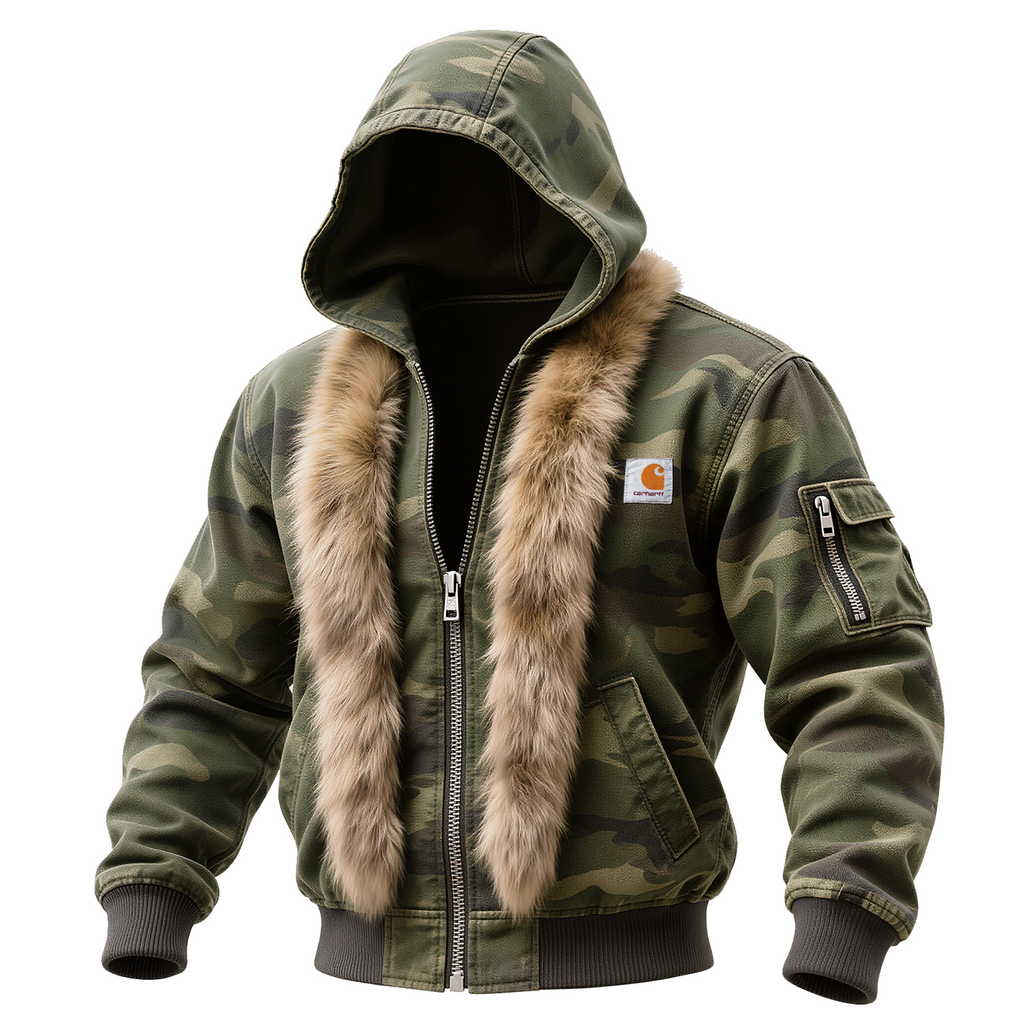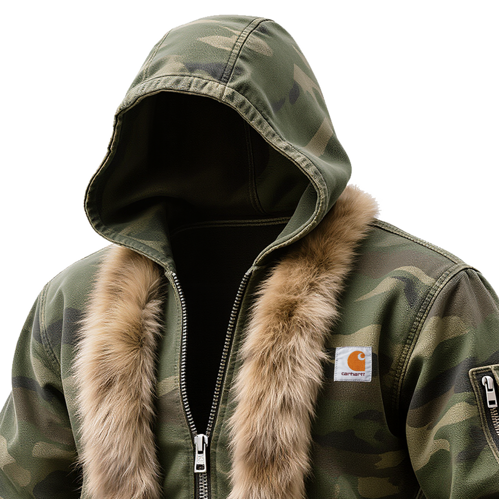 Men's Vintage Camo Hooded Jacket With Fur Trim