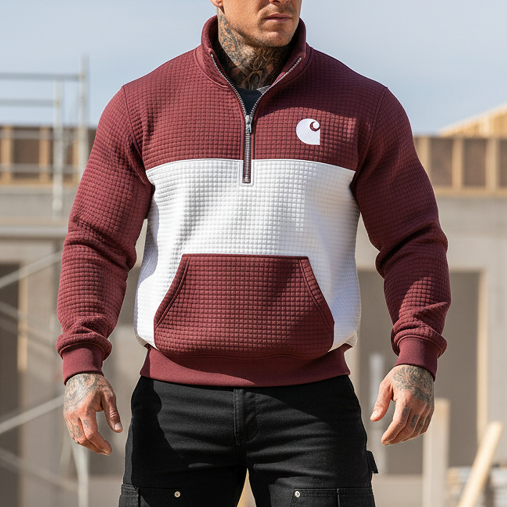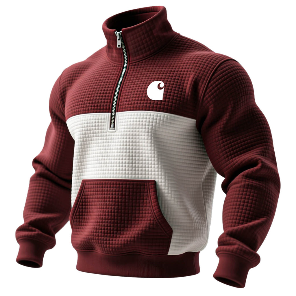 Men's Vintage Burgundy And White Waffle Quilted Plaid Zipper Stand Collar Sweatshirt