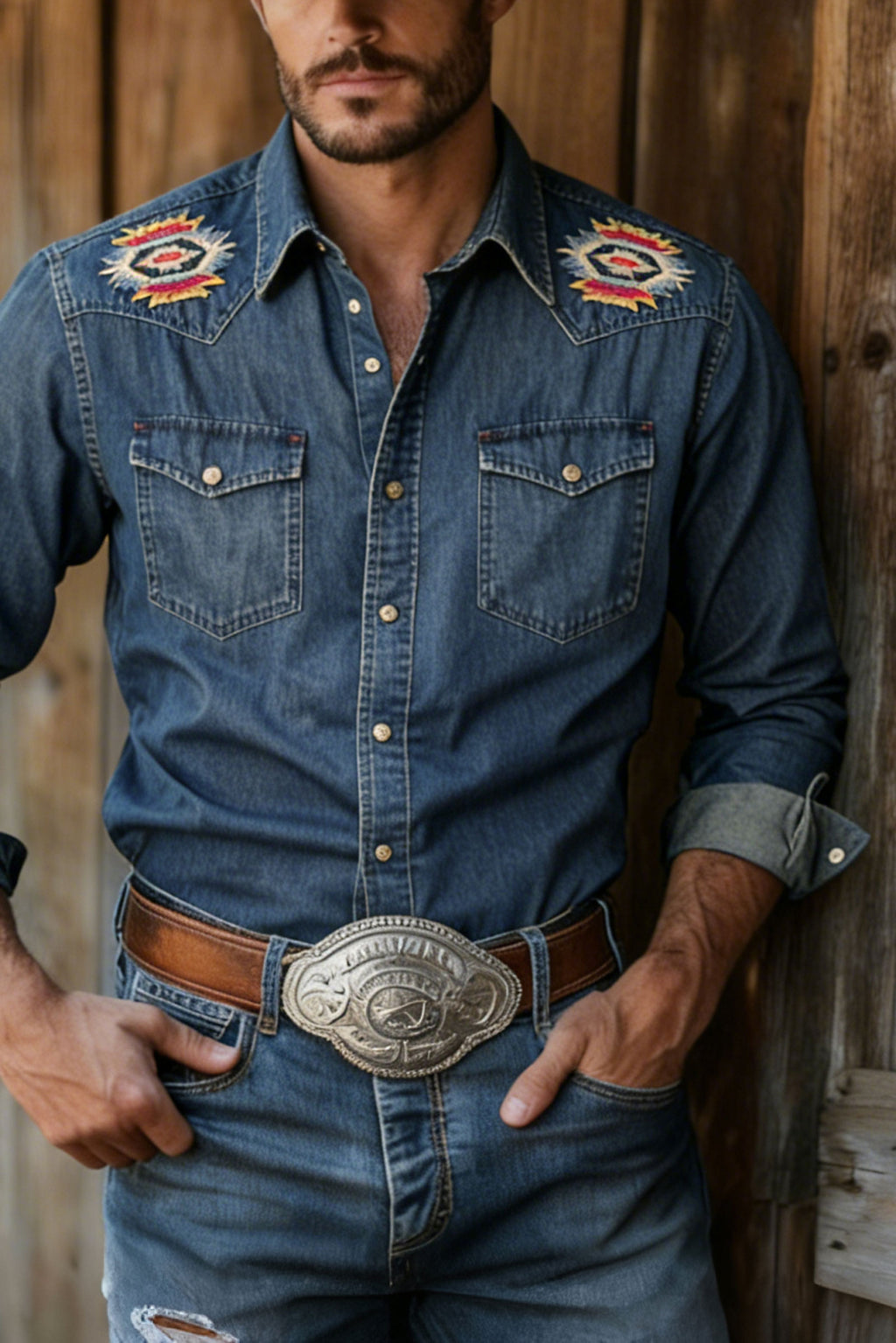 • Design Elements: Traditional Western Stitching, Vibrant Patchwork Motifs on Shoulders