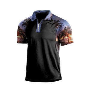 BEACH ZIPPER PRINTED PATCHWORK RAGLAN POLO SHIRT